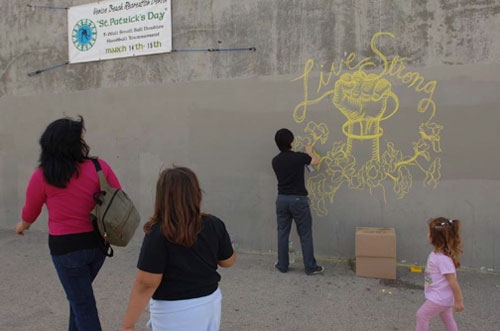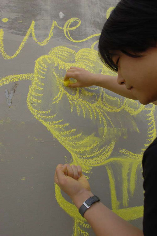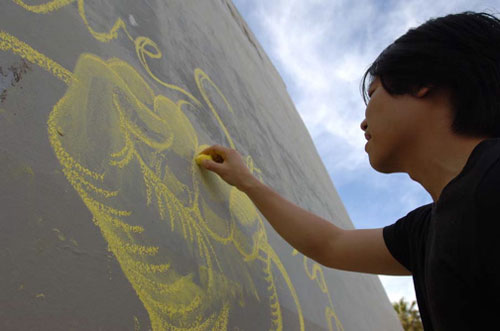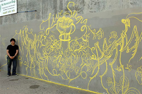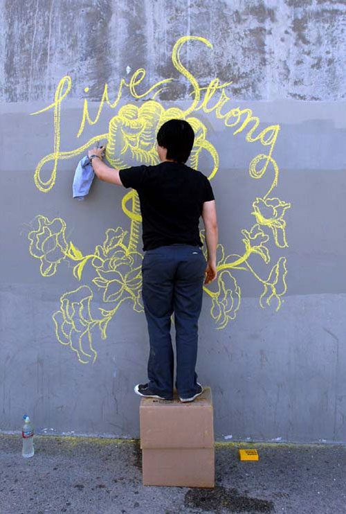 Supertouch reports that Lance Armstrong has commissioned several artists to create chalk art in the streets of LA to raise awareness for his Livestrong foundation. Enjoy some images of James Jean’s fantastic contribution!