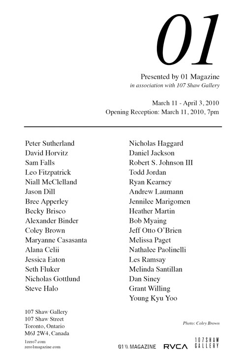 Heads up Toronto! The 01 Magazine group show is goin’ down at 107 Shaw Gallery this Thursday (March 11 @ 7PM). The line up of people showing work is STUPID! Get out there and enjoy it!