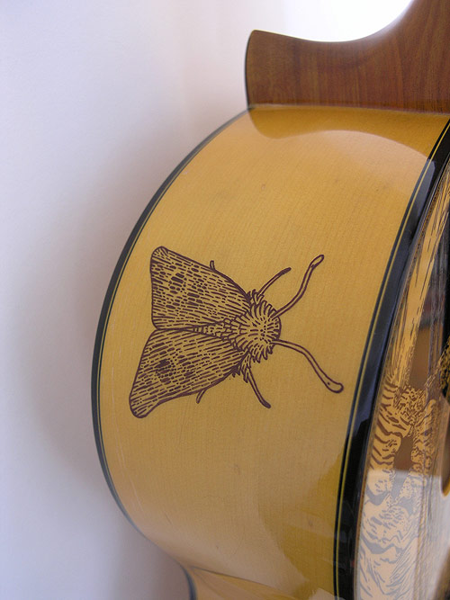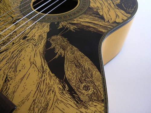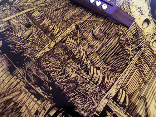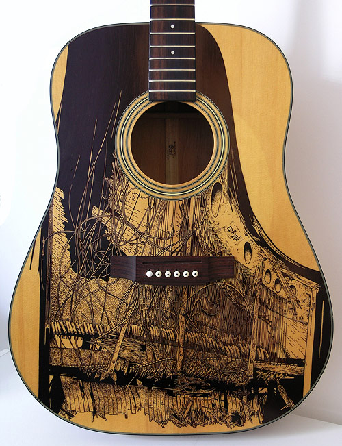 Beautiful ink drawings on guitars by Patrick Fisher.