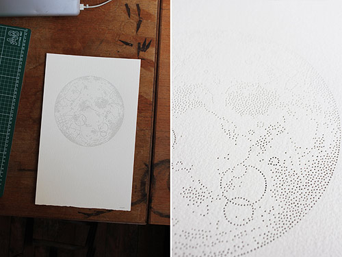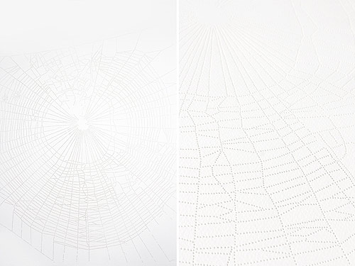 Beautiful pinprick drawings by Miso. This first one is a map of a block in Brooklyn, hidden inside a moon. The second one is a map of Berlin hidden inside of a spider web. See below!