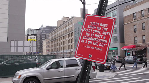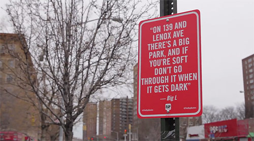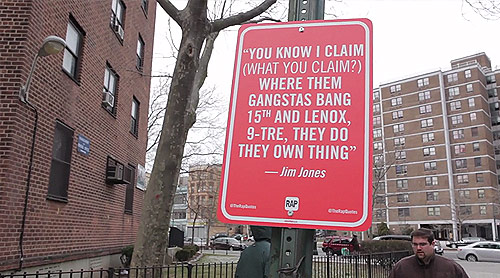Brilliant project by artist Jay Shells, he’s locating specific New York spots mentioned in rap songs and installing his own street signs. Love his sense of humour! A couple years ago Shells was interviewed by Fox News about his street ettiquette signs and mentioned he wanted to make a sign that said “Fox News Lies” (see here).