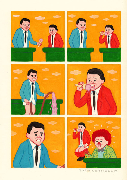 Comics by Joan Cornellà. I have been staring at this first one for an hour. It is so absurd. I love it, I love everything about it. More comics below (some of them are kinda dark).