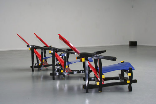 I often check Julien Berthier’s website hoping to find new work. I didn’t find any today, so I’m posting more of his old work. This piece is the result of Berthier drawing Gerrit Rietveld’s famous “Red and Blue Chair”, using his left hand. A carpenter was given the drawing and instructed to produce five identical chairs.