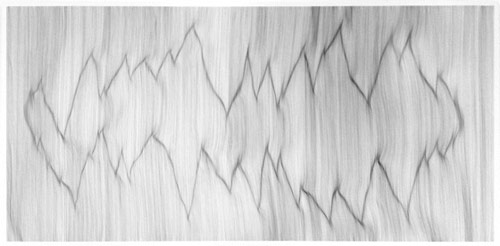 He starts with a straight line all the way down a page, and then slowly draws another line beside it. He tries his best to copy the line exactly but inevitably there are tiny imperfections. These “mistakes” are amplified as he copies each new line, and the drawing begins to reveal itself like a curtain.