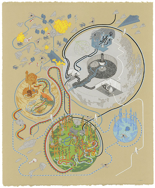 Love these maps based on popular movies, by illustrator Andrew Degraff. The first three are the Indiana Jones films, the next three are Star Wars, and I had to throw Goonies in there. See them all below.