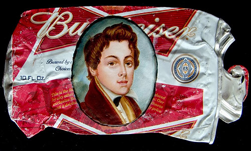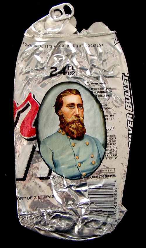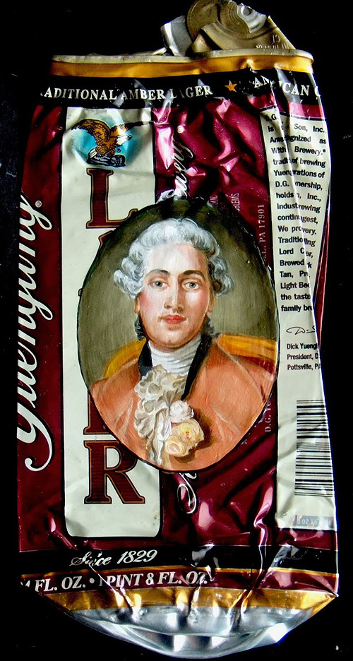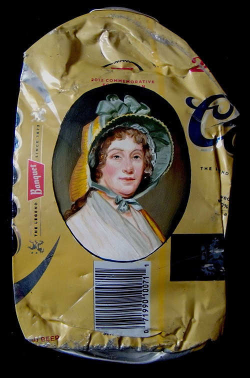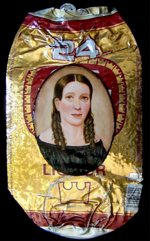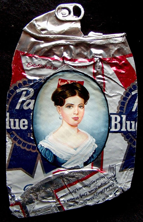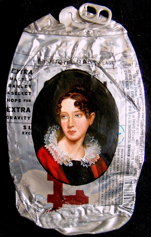 For the past ten years Philadelphia-based artist Kim Alsbrooks has been painting miniature portraits on trash. Her series “My White Trash Family” began when she became interested in historical biases in art, and specifically portraits painted during the watercolor on ivory era (17th-18th century).