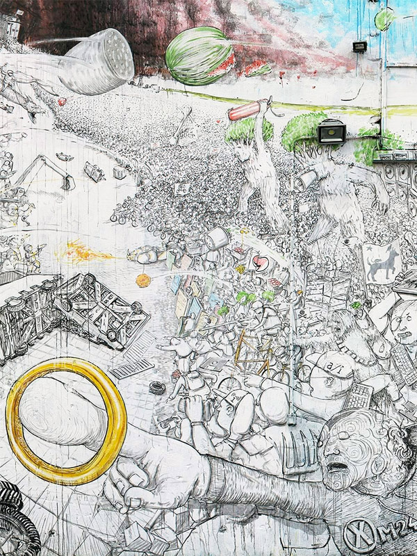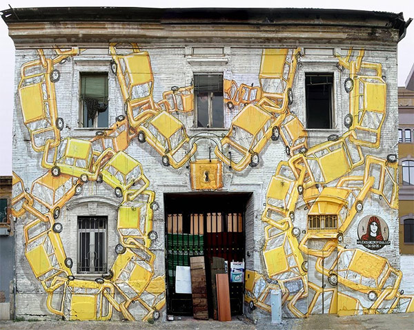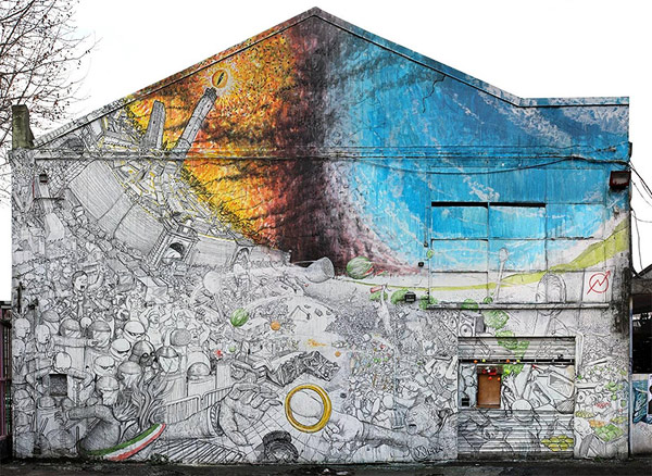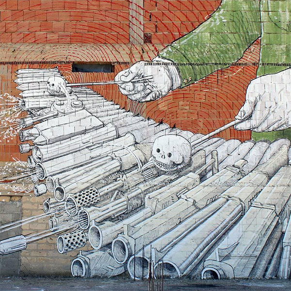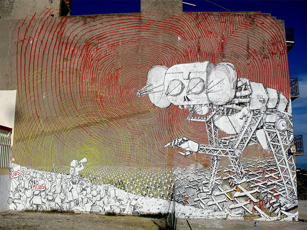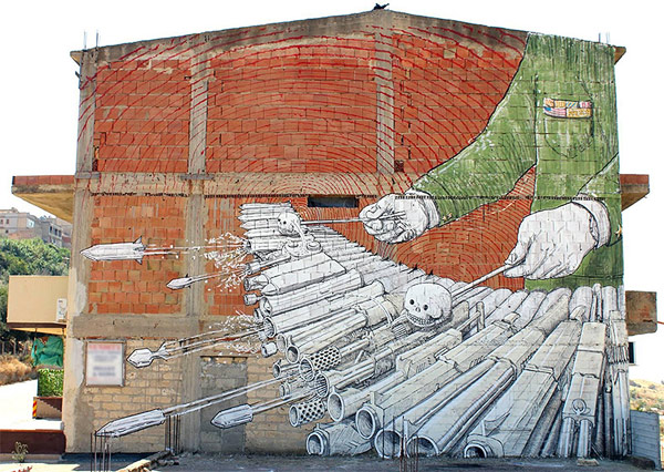 Love these recent murals by Blu, on the streets of Italy. This first one especially! More images below.