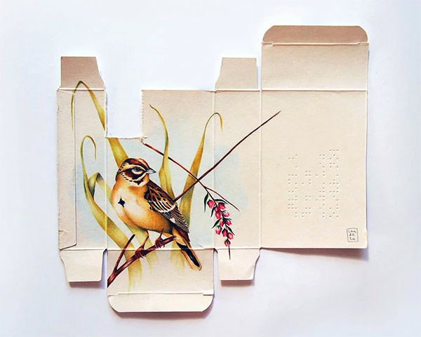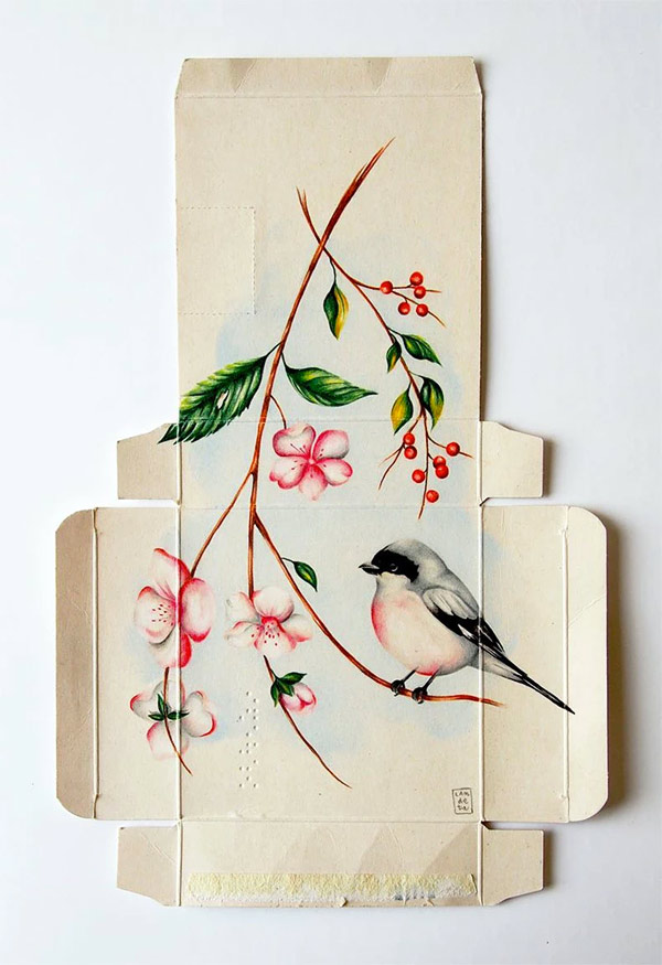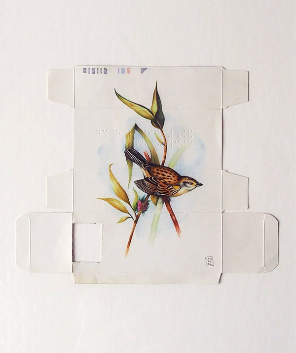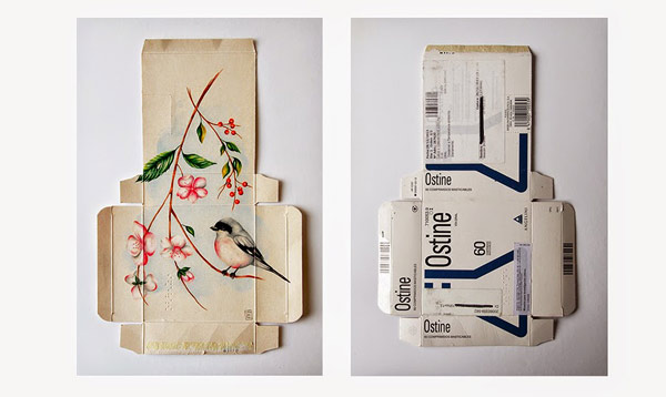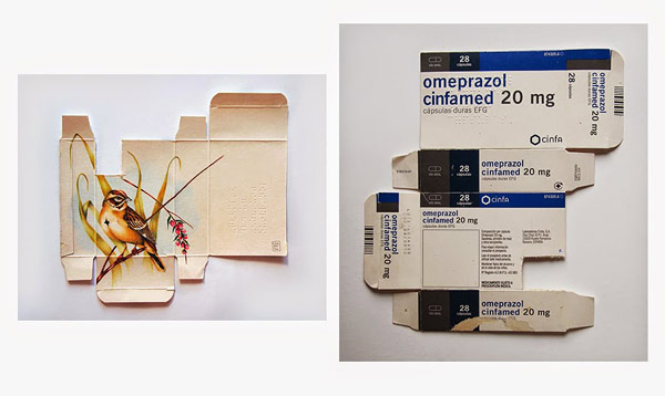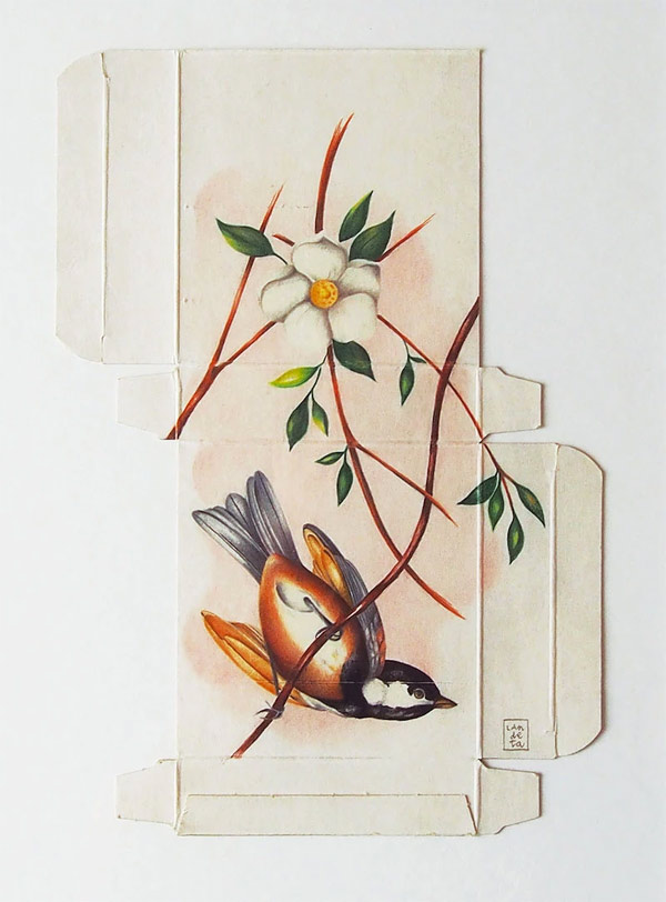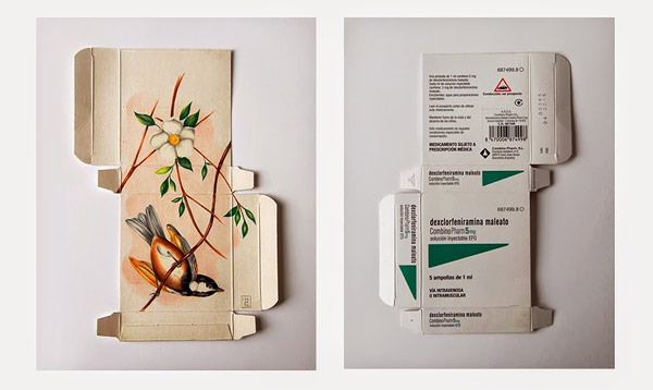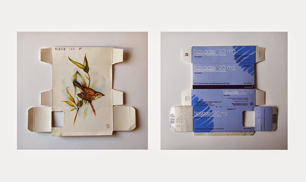 Paintings of birds on pharmaceutical boxes by artist Sara Landeta. I’m actually nervous about even typing the word pharmaceutical in this post (now it’s in here twice, aaah) I feel like it’s like asking for spam comments. Anyways, I like this series. More images below.