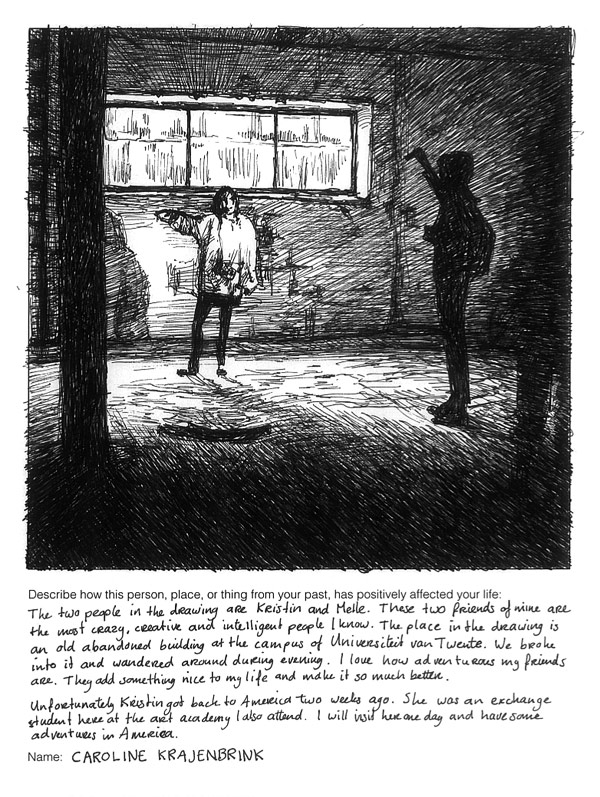 She writes: “The two people in the drawing are Kristin and Melle. These two friends of mine are the most crazy, creative and intelligent people I know. The place in the drawing is an old abandoned building at the campus of Universiteit van Twente. We broke into it and wandered around during evening. I love how adventurous my friends are. They add something nice to my life and make it so much better.