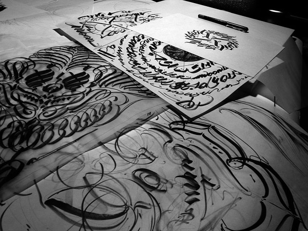 Renowned Japanese artist Usugrow is releasing a book with Upper Playground, and will be signing copies at their San Francisco location this Sunday. The artist is also busy finishing work for his solo show “Inkflow” opening at Fifty24SF Gallery on October 4th. He might be my favourite letterer of all time. Have a look at some more process images below.