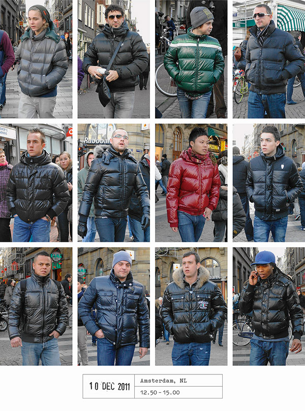 Hans Eijkelboom would hang around areas with lots of pedestrians, often near malls, and look for recurring elements. These could be things like men carrying purses, or couples walking arm in arm, band t-shirts, or gelled hair. He would shoot for anywhere from half an hour to several hours, using a camera hung around his neck and a trigger in his pocket. Later, in his Amsterdam studio he’d arrange the images into grids that he called ‘Photo Notes’.