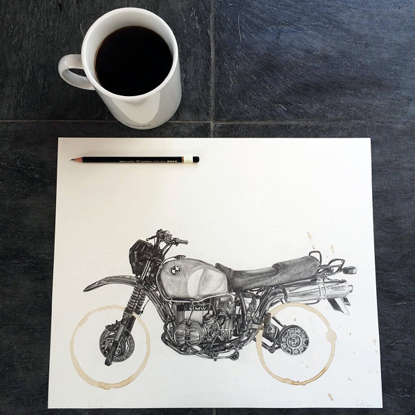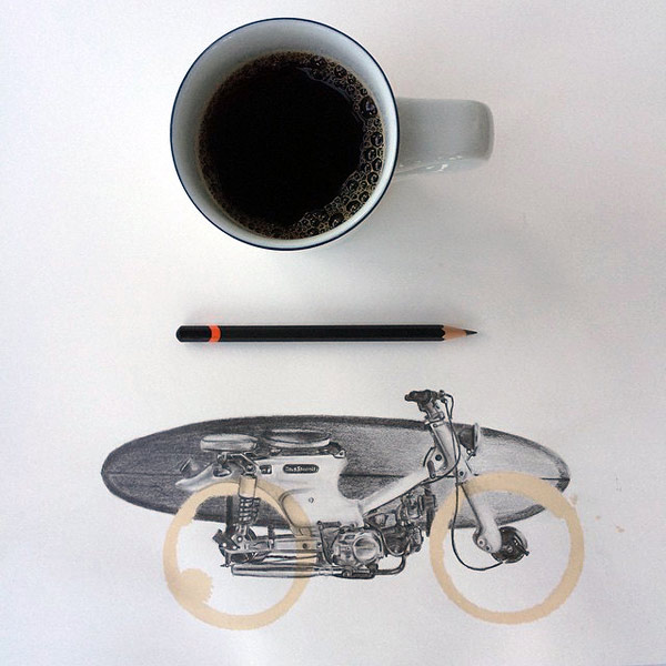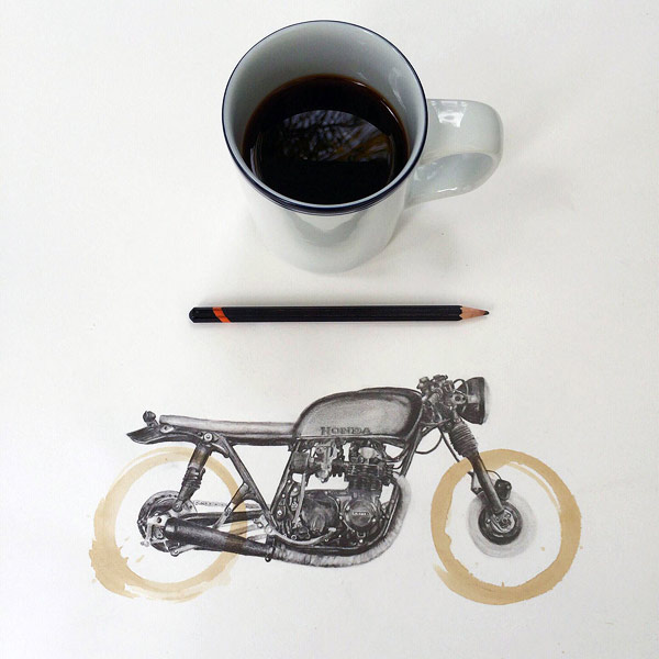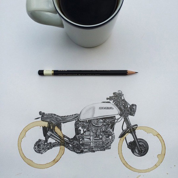 Drawings of motorcycles by artist Carter Asmann, using the stains left by coffee cups. More below.