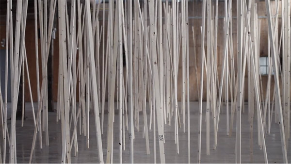 New sound installation by Swiss artist Zimoun (previously featured here and here), at Knockdown Center, in New York. The exhibition is part of 3 concurrent solo exhibitions in New York (Bitforms gallery NYC, Knockdown Center NYC, and Simons Gallery for Geometry and Physics at the Stony Brook University). Zimoun often utilizes cotton balls and cardboard boxes but this piece is made of rope and wood.