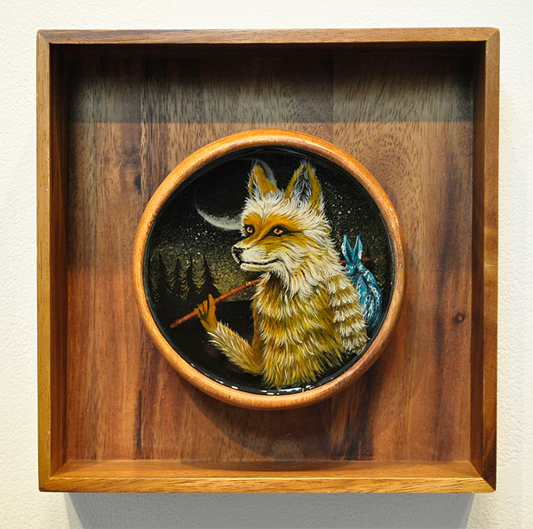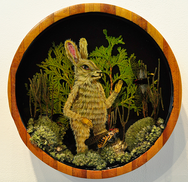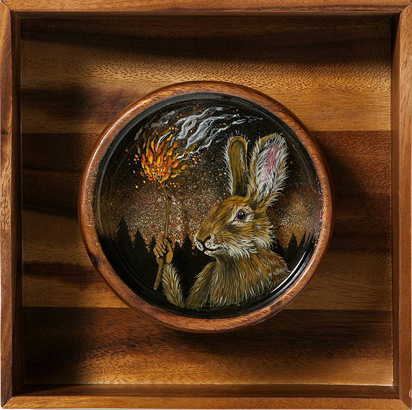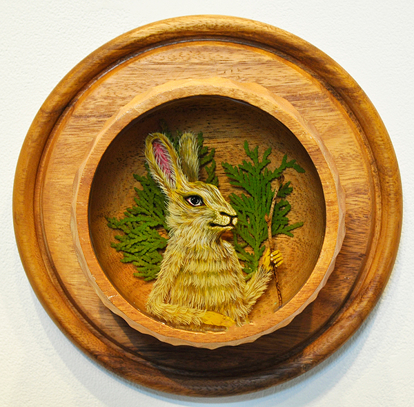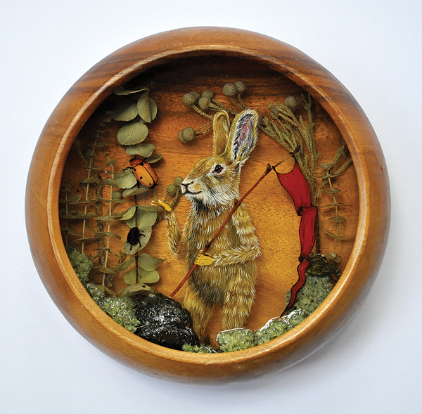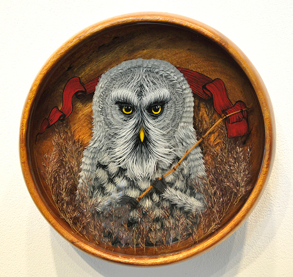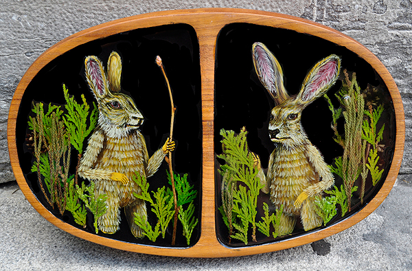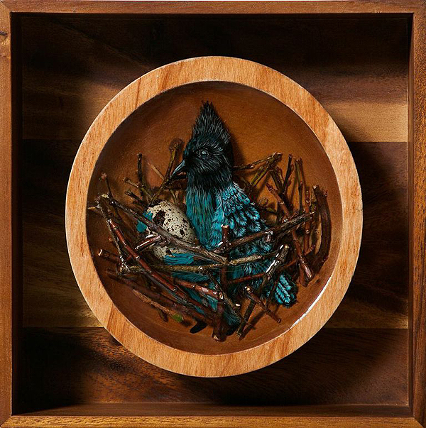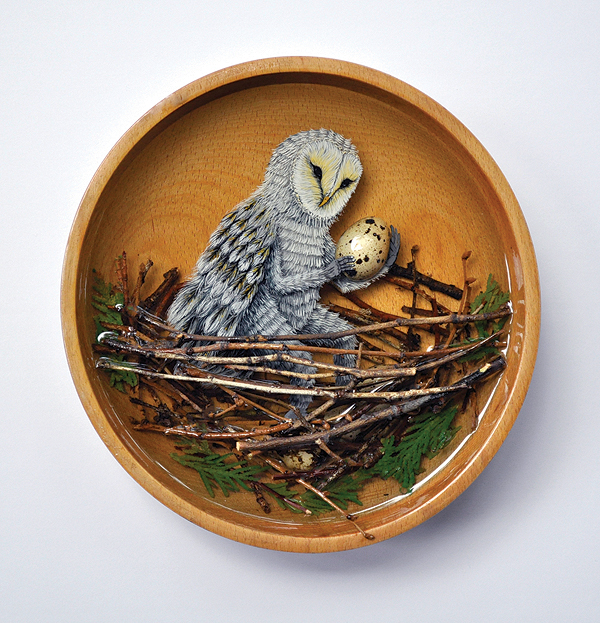 Ottawa-based artist-carpenter Drew Mosley uses wooden bowls and found objects like twigs, leaves, and eggs to create shadowy, three dimensional spaces to house his paintings of forest creatures. See more images of Mosley’s work below!