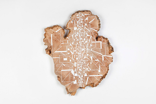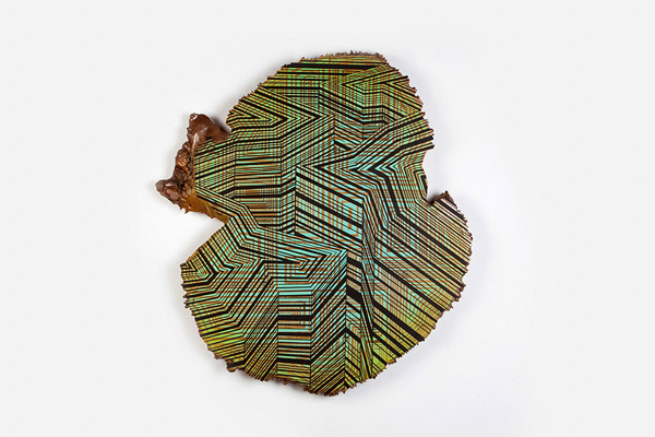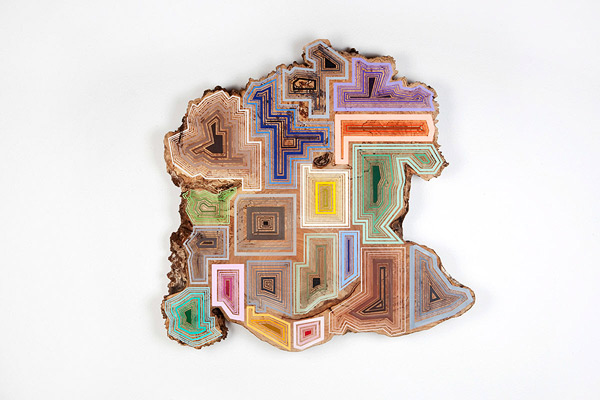 Fantastic juxtaposition of natural wood with brightly coloured, geometric patterns by mixed media artist, Jason Middlebrook. Middlebrook currently lives and works in Hudson, NY. More images from “Gold Rush” (on display at Peters Projects in Santa Fe until October) below!