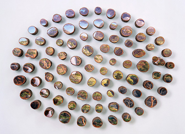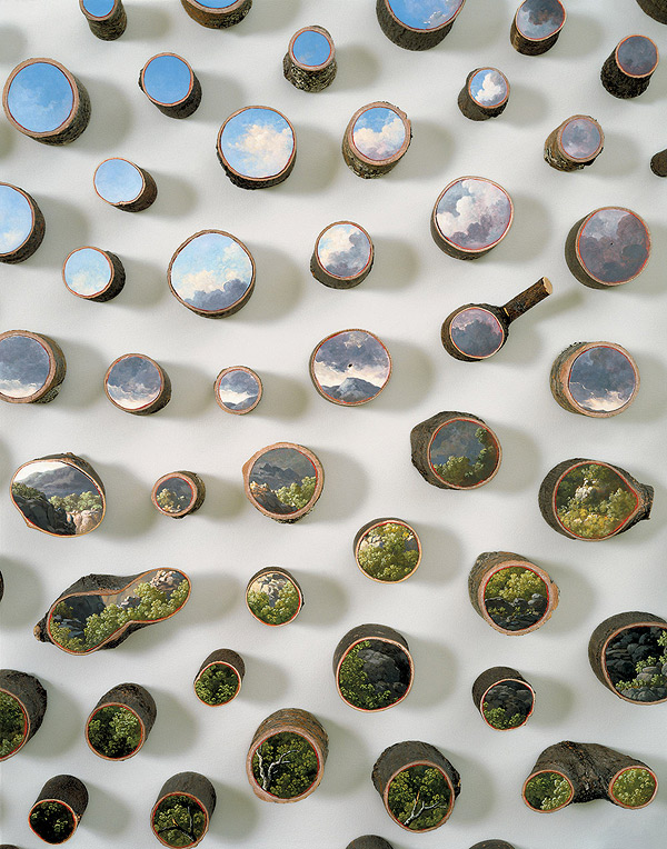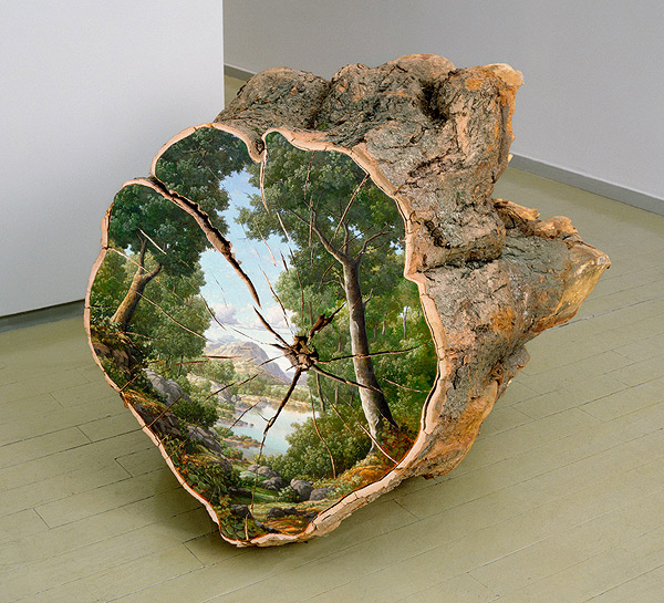 New York-based artist Alison Moritsugu’s log paintings are so meta your head might explode. The wood used in her log series are collected from the areas depicted on the landscapes she paints on them. The salvaged logs have all also fallen naturally and contribute to a larger environmental statement about our idealized and mistaken beliefs that the wilderness will always be there. More images below!