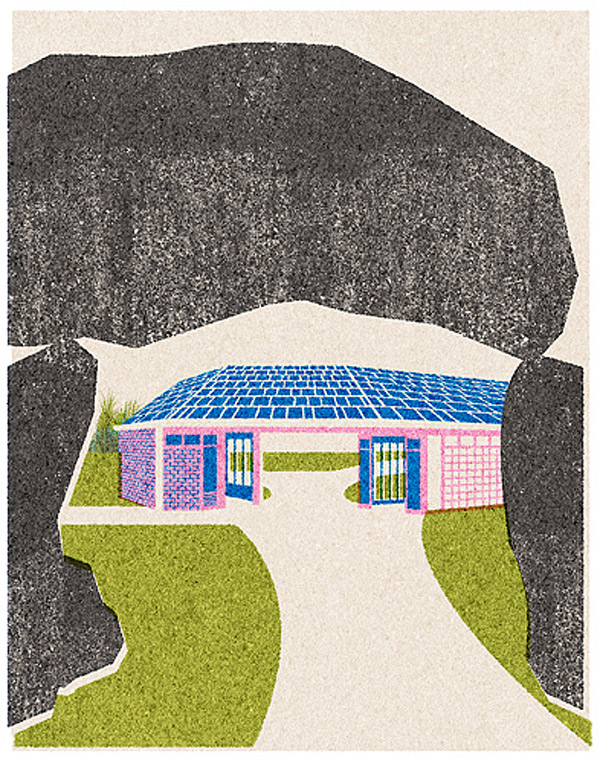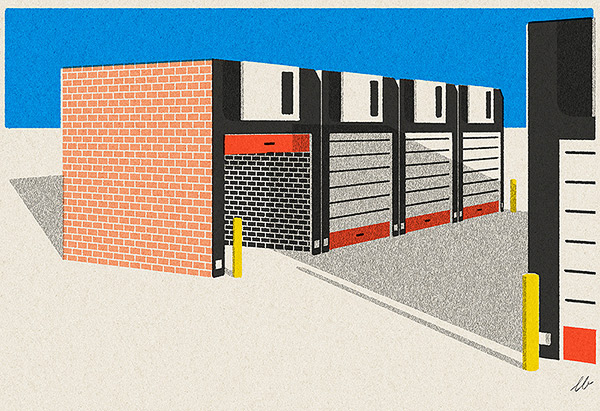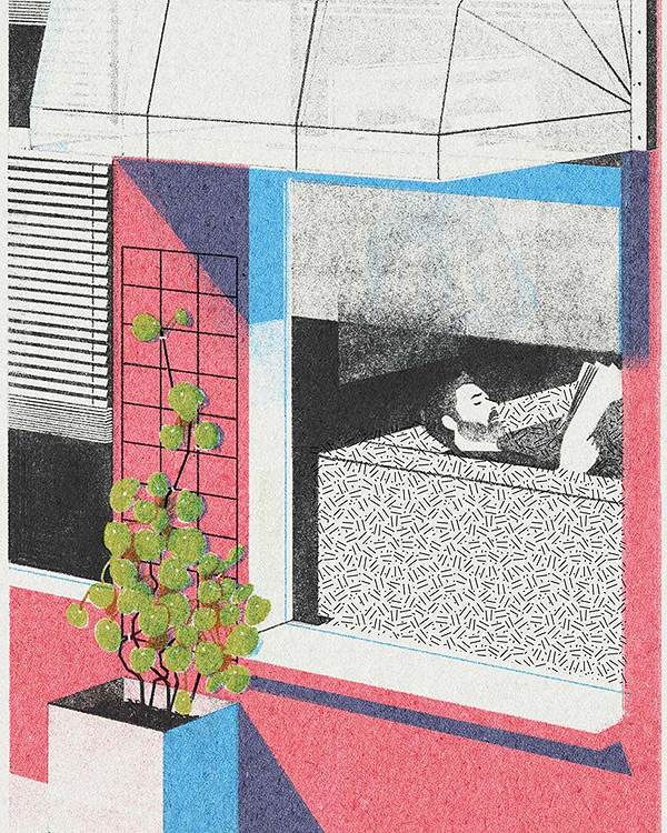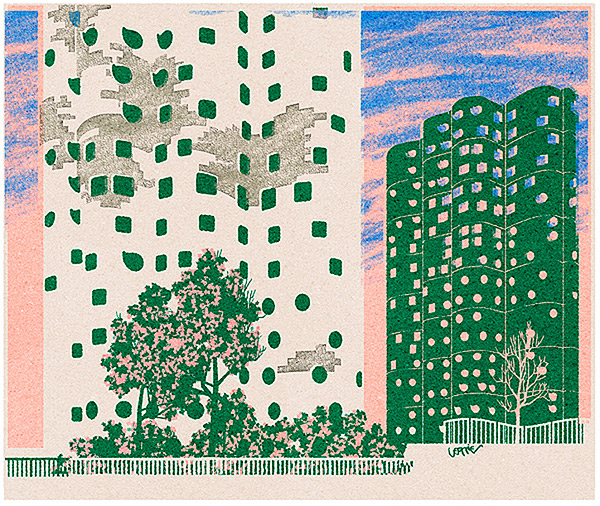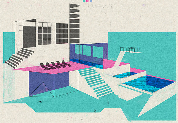 Lovely architectural illustrations by Amsterdam-based artist Leonie Bos. Bos adapts traditional printmaking techniques, creating different shades and colours in her digital images by layering semi-transparent tones. See more images below.