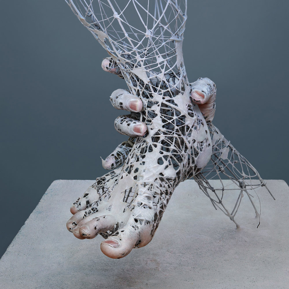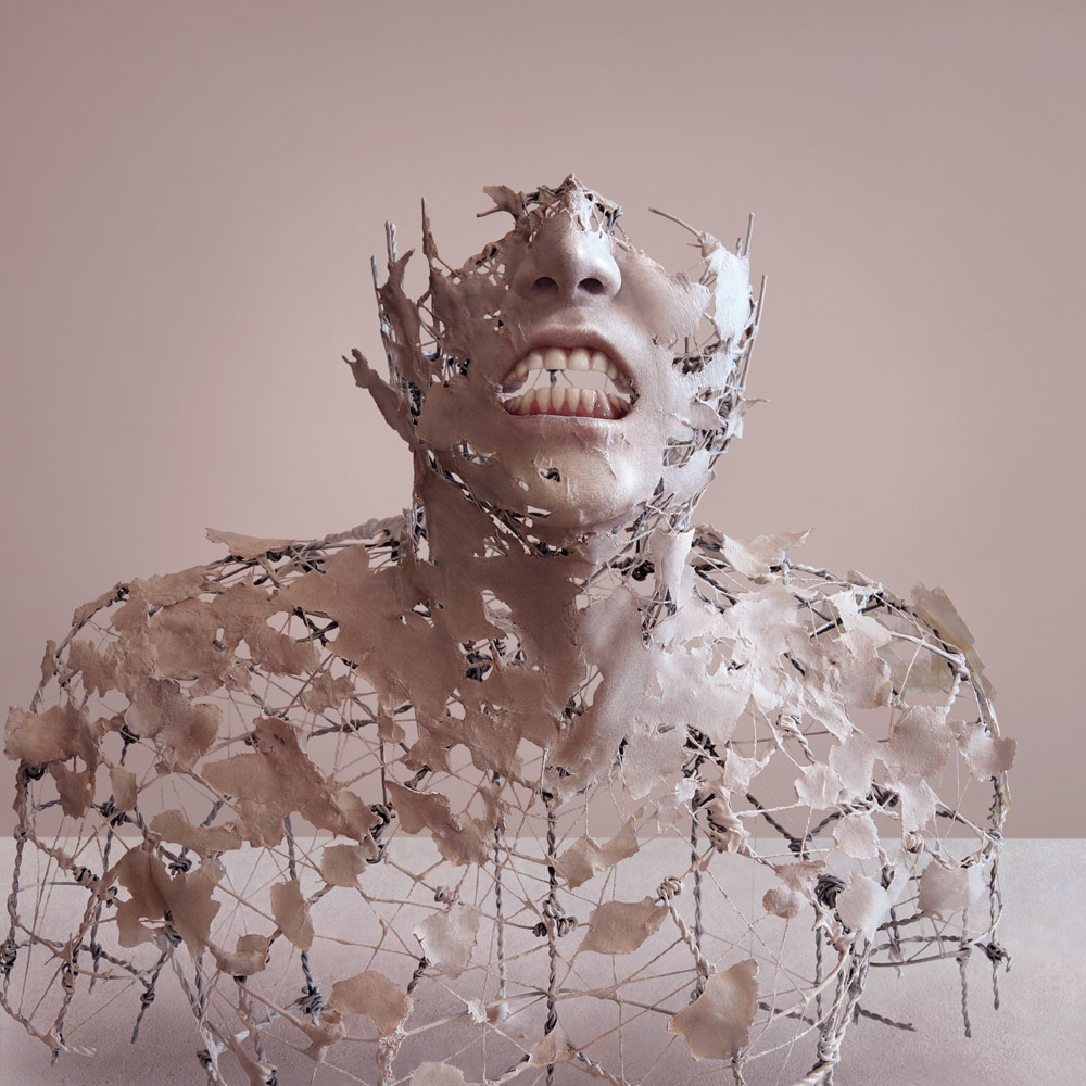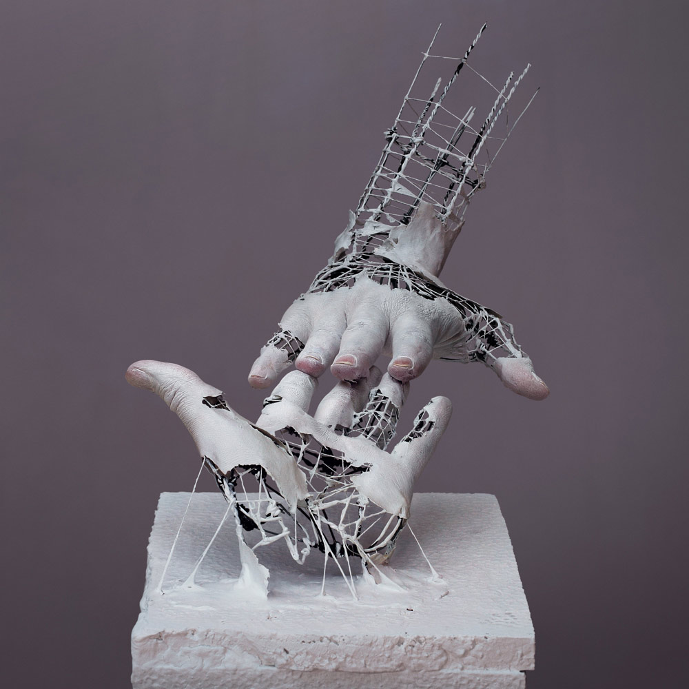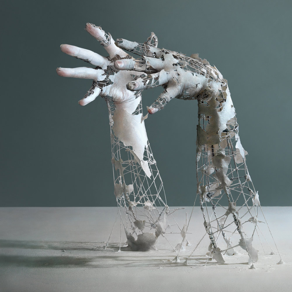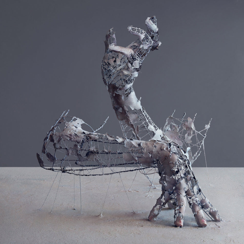 Japanese Artist Yuichi Ikehata’s works are a clever combination of digital and physical. Photos of sculptures made of wire, clay, and paper are subtly merged with images of the artist’s own body painted white. The viewer is left to question what’s real. See more of Ikehata’s work below.