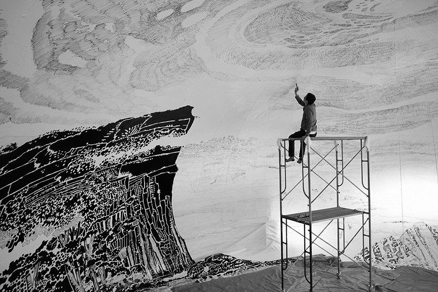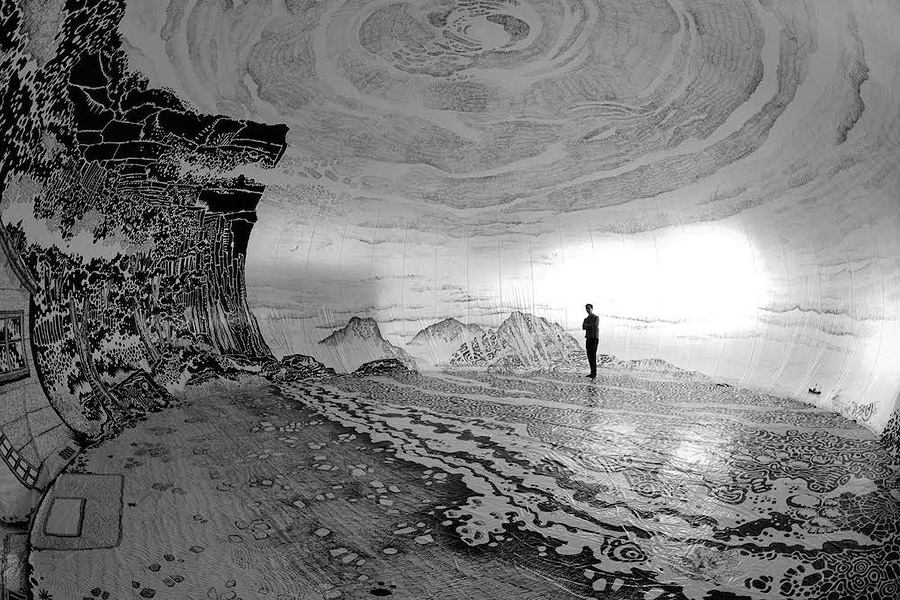 Constructed at a former soy sauce factory for this year’s Setouchi Triennale art festival, Oscar Oiwa’s “Oiwa Island 2” is an immersive 360 degree drawing set inside a 40-foot inflatable dome. The trippy black and white landscape features a cabin on the shores of a beach and gradually becomes more abstract the further out it moves from the cabin door (which also acts as the dome’s entrance). More images and short video below!