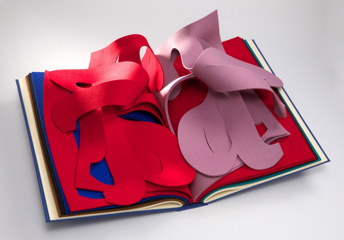 Strangely satisfying felt book sculpture of the lowercase letter ‘a’ by American artist Blake Rayne. “Almanac” was conceived virtually, then physically cut and rearranged as a commentary on processes of translation and communication in the modern world. See more images below.