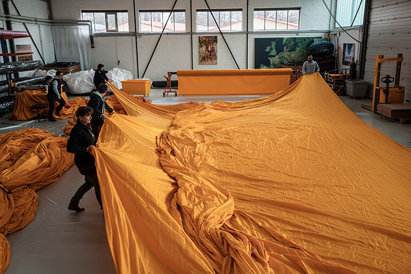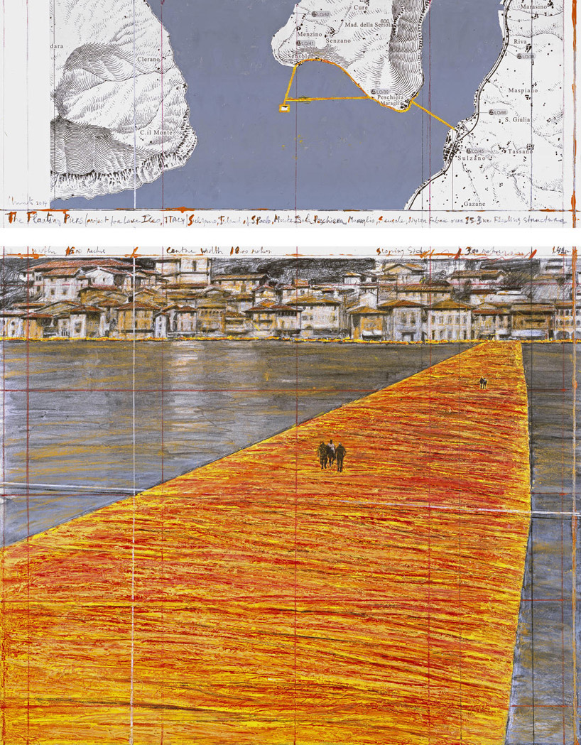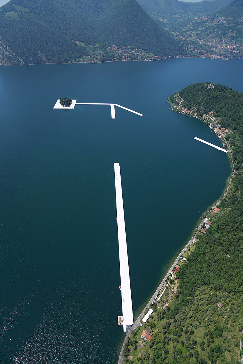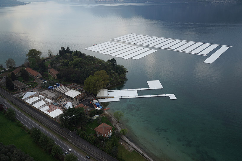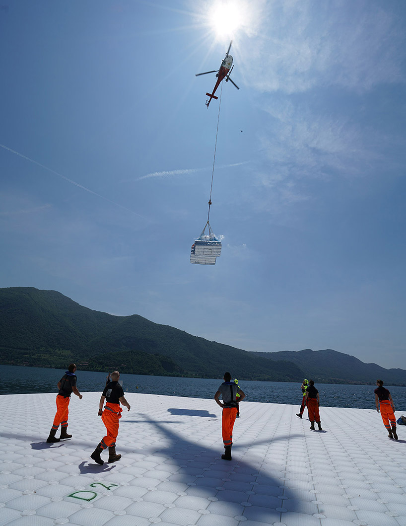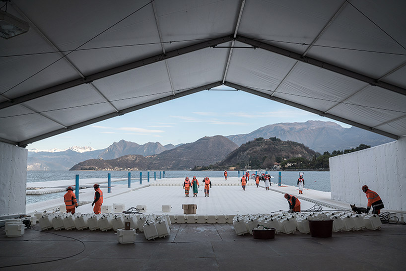 The project is the brainchild of artists Christo and Jeanne-Claude, known for large-scale installations. Although Jeanne-Claude passed away in 2009, Christo has continued to pursue “The Floating Piers”, originally conceived together in 1970. More progress shots below!