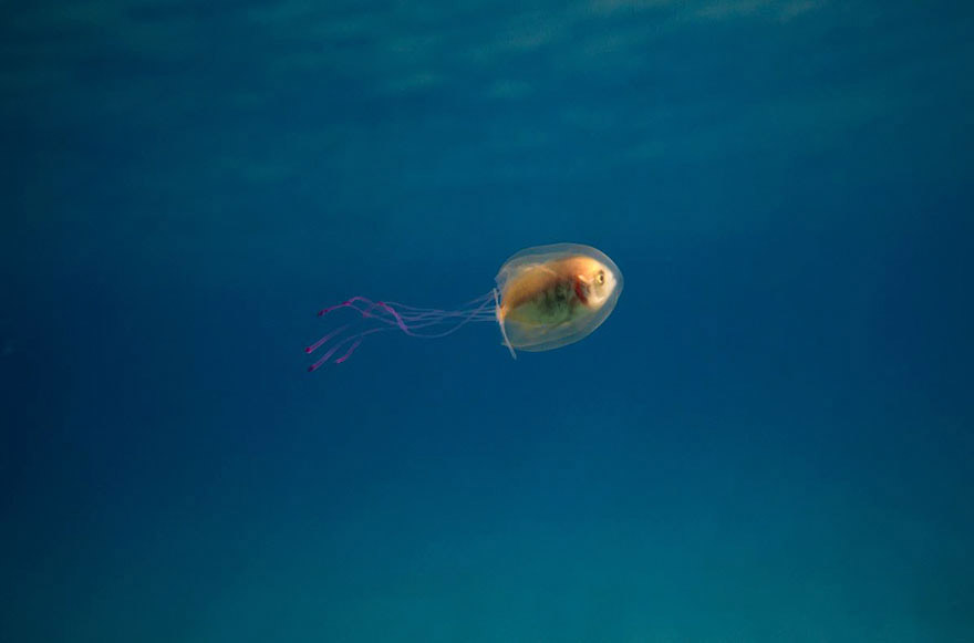 Australian photographer Tim Samuel stumbles upon a fish trapped inside a jellyfish while free diving in Byron Bay. Gotta love how the fish just keeps swimming! More shots of the bizarre occurrence below.