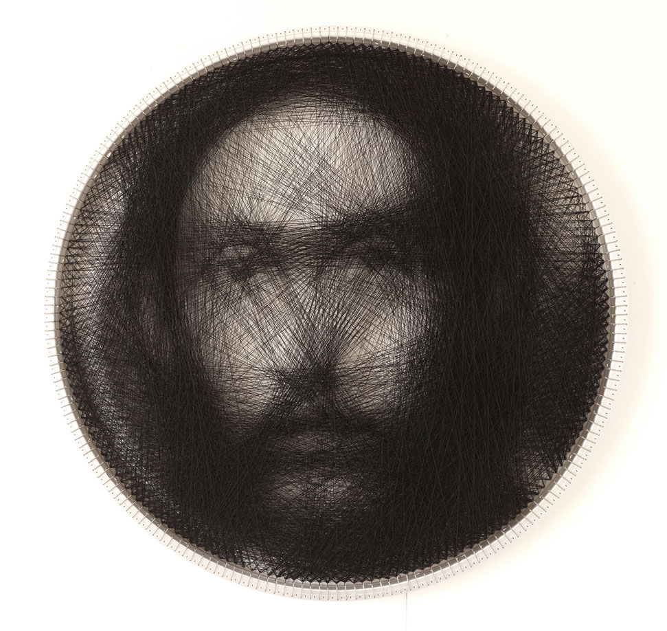Using a 28″ aluminum-rimmed loom, Petros runs a single thread from one anchor peg to another to create just the right density and darkening at precise intersections. The end result is a detailed image that emerges from 3000 – 4000 continuous loops (or 1-2 kilometers of thread)!