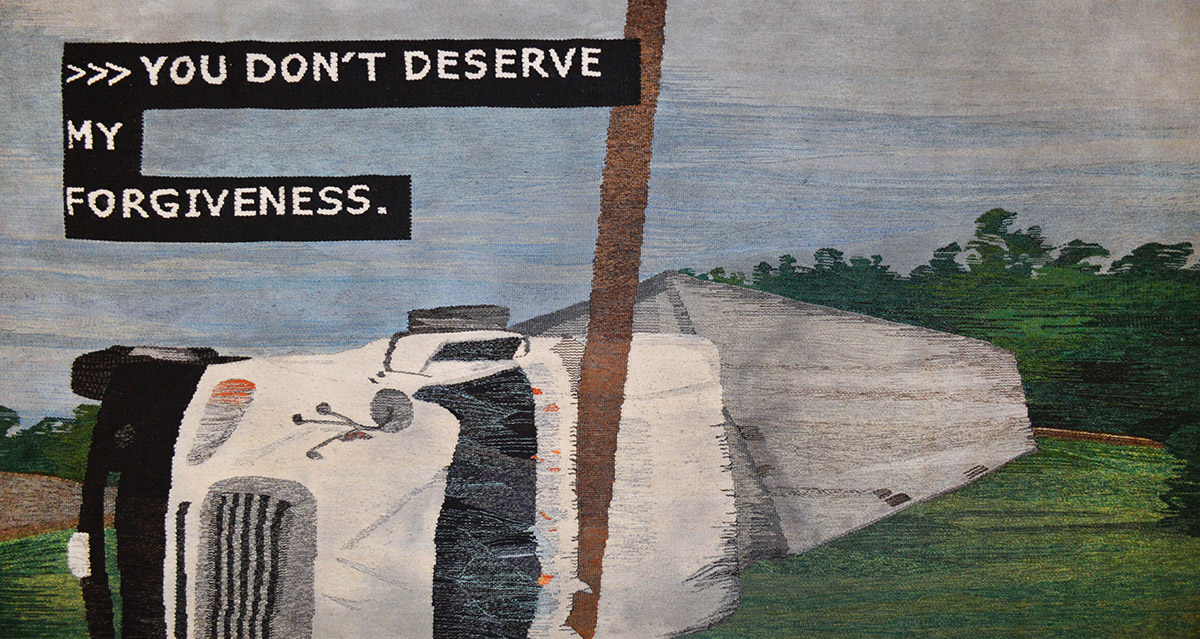 Brooklyn-based artist Erin M. Riley memorializes fleeting moments (often violent or traumatic) in large-scale tapestries. See more images below or on display at Hashimoto Contemporary in San Francisco March 2 – 25.
