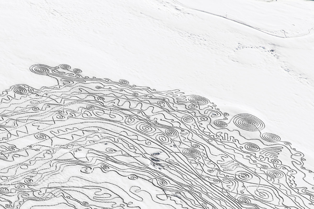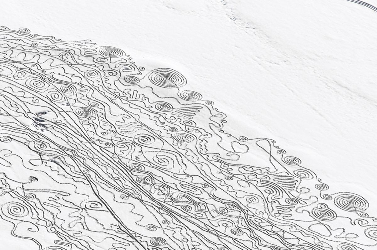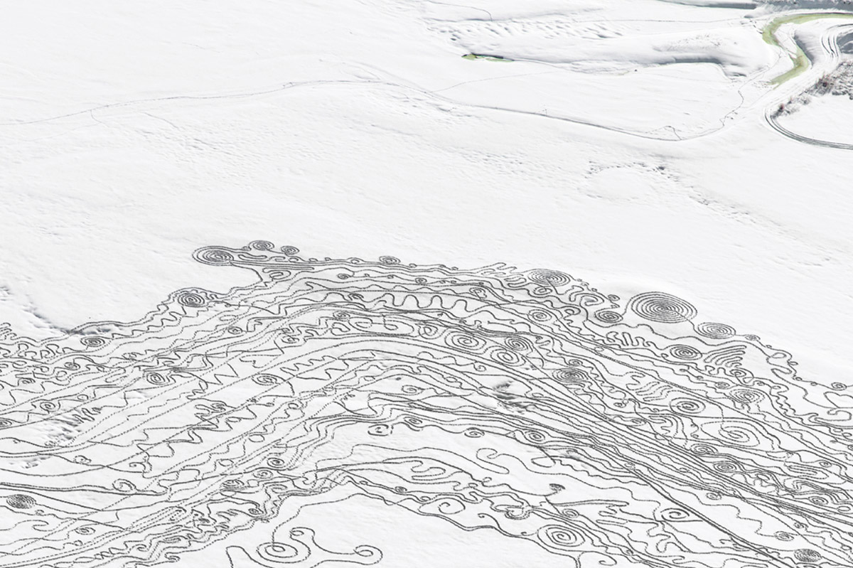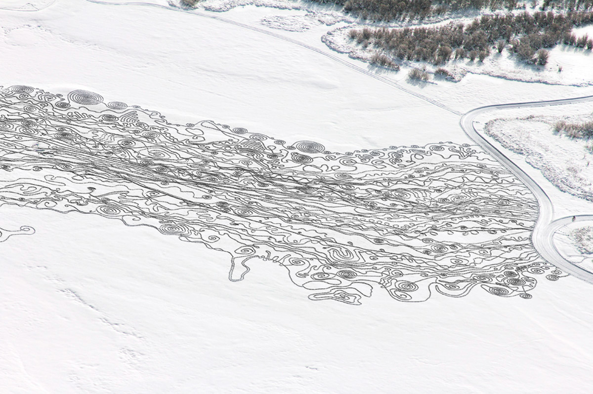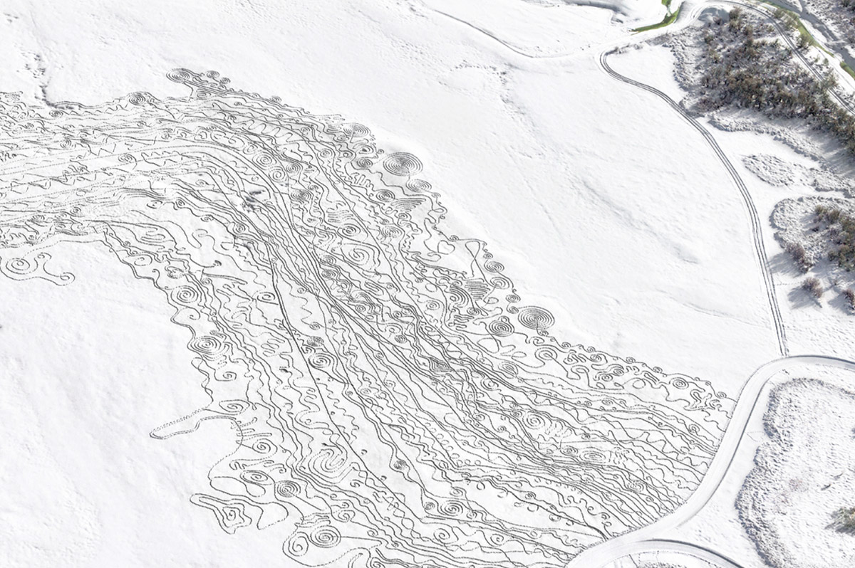 Another incredible snow drawing by artist Sonja Hinrichsen (previously featured here)! Made in the snow covering Lake Catamount in Colorado last year, the site-specific piece pays homage to the Yampa River which used to run through the valley.
