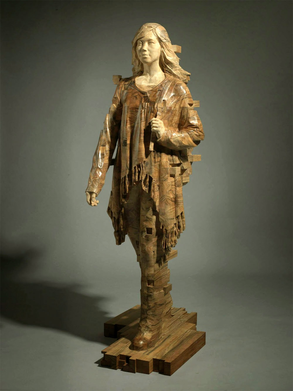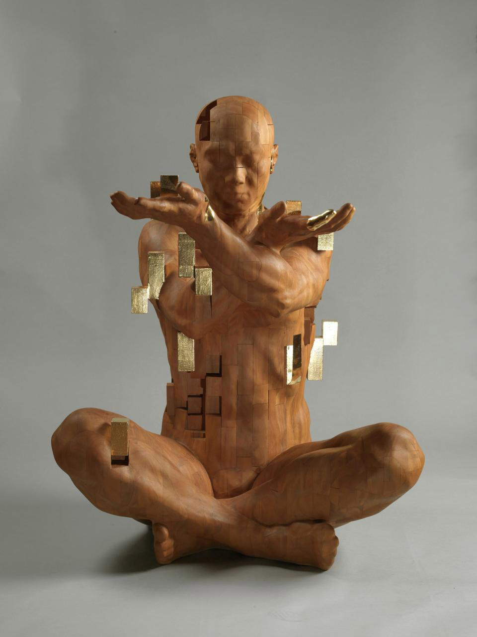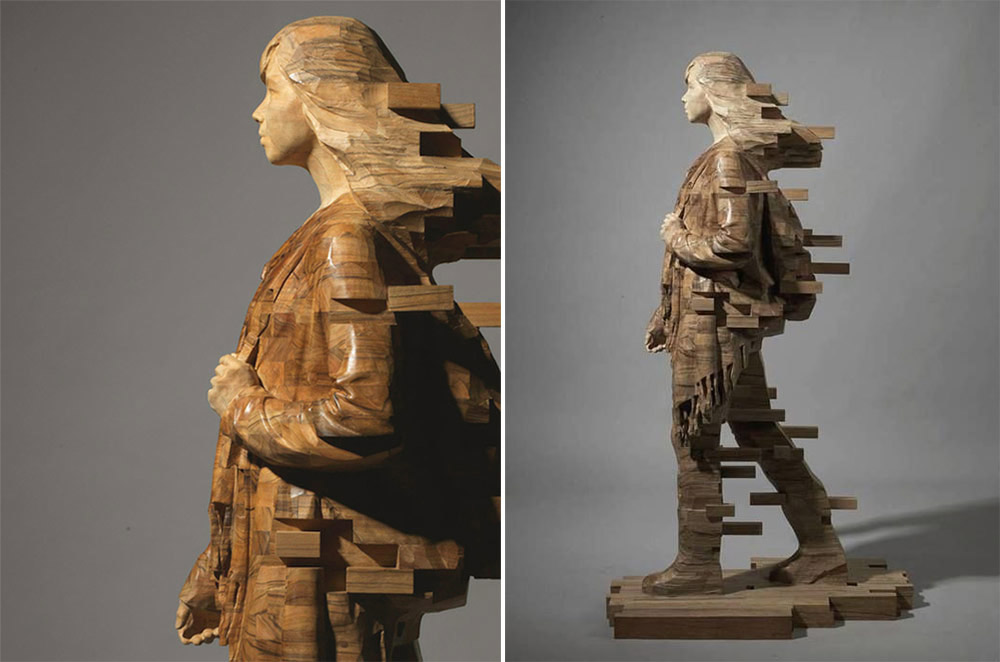 Taiwanese artist Hsu Tung Han creates incredible figurative sculptures that appear to be dissolving into a field of pixels. Approaching each piece like a puzzle, Han carefully plans through sketches and clay models before the final wood segments are carved. See more images below.