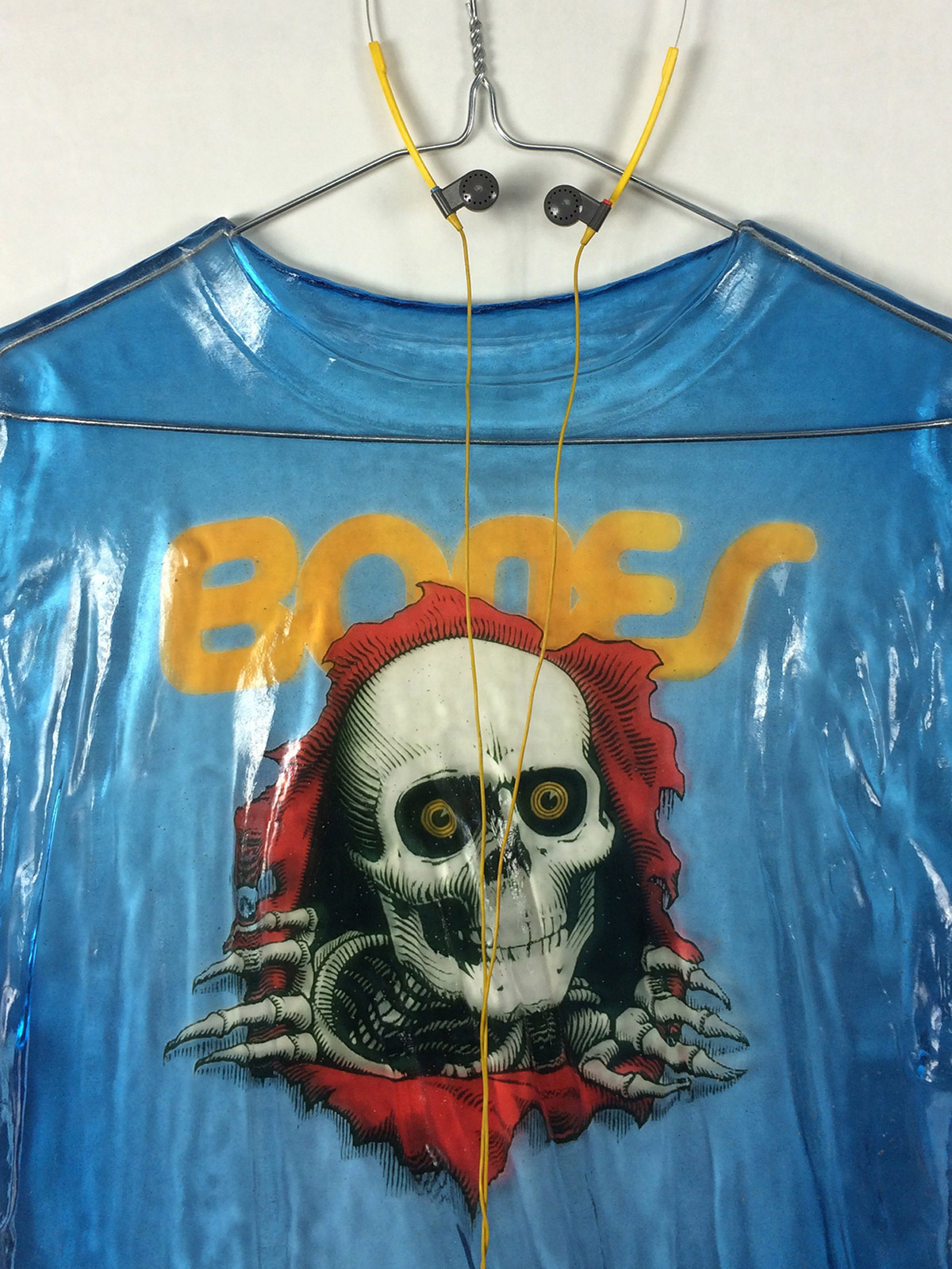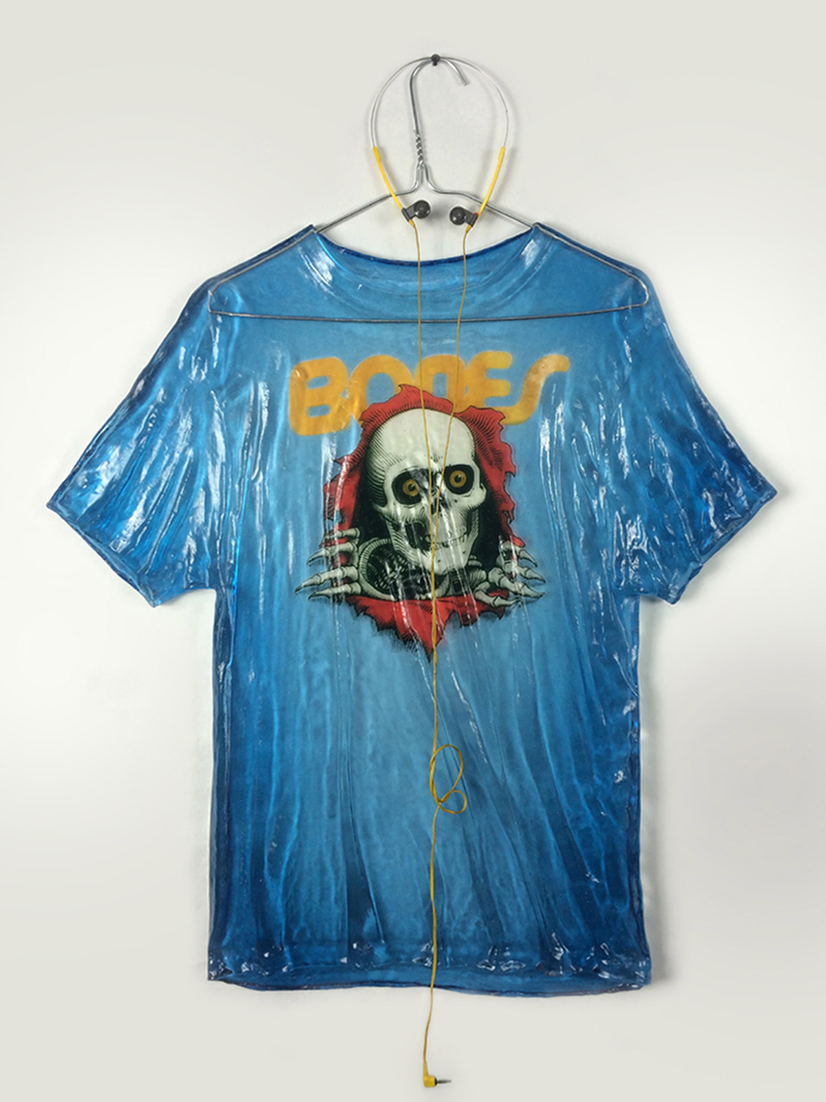 A series of hanging sculptures made from cast UV-stable epoxy resin by artist Chris Bakay. Created in honour of his older brother, David, who passed away in 1996 — a time before iPhones and Instagram were around to provide an abundance of pictures and video to remember him by. What Chris has instead are some of David’s things, sunglasses and headphones, cherished and now immortalized through his work. See more images from “Retired Jerseys” below.