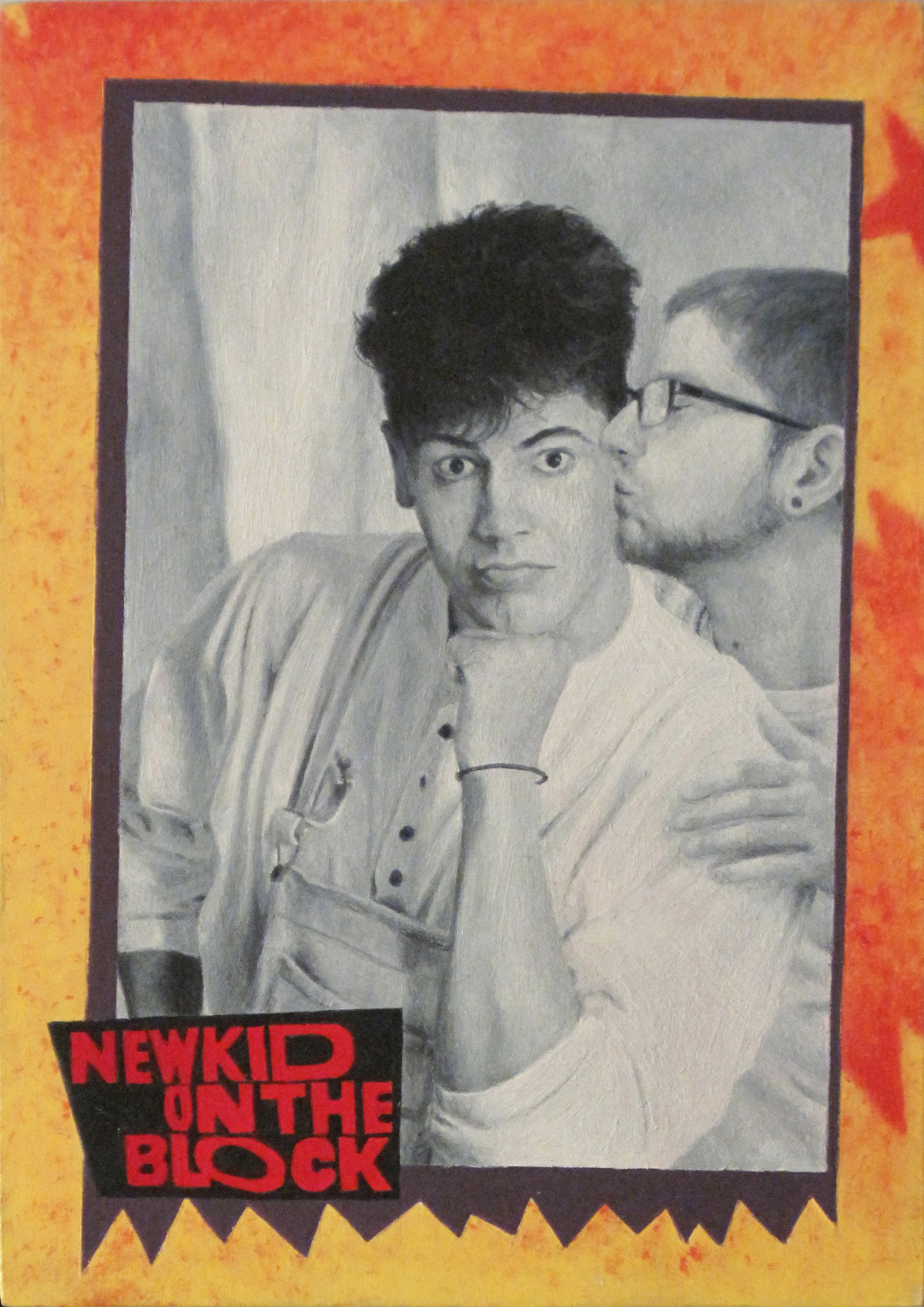 Artist Cobi Moules re-creates NKOTB posters and trading cards, inserting himself into the group. As a transgender man, the project is both a nostalgic reclamation of Moules’ childhood obsession and a playful meditation on the desires of his youth. See more images from “New Kid” below!