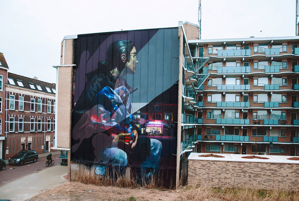 Another batch of murals by artist duo Telmo Pieper and Miel Krutzmann (aka Telmo Miel), including “Hit the Lights,” a collaboration with Spanish artist Sebas Velasco (organized by Sober Collective) in The Netherlands as well as their piece with Evoca in Honolulu. Images below.