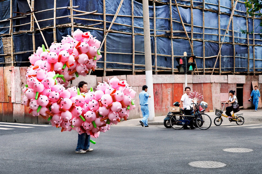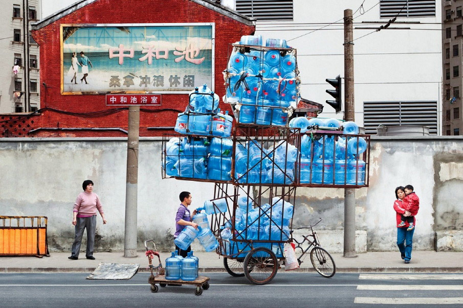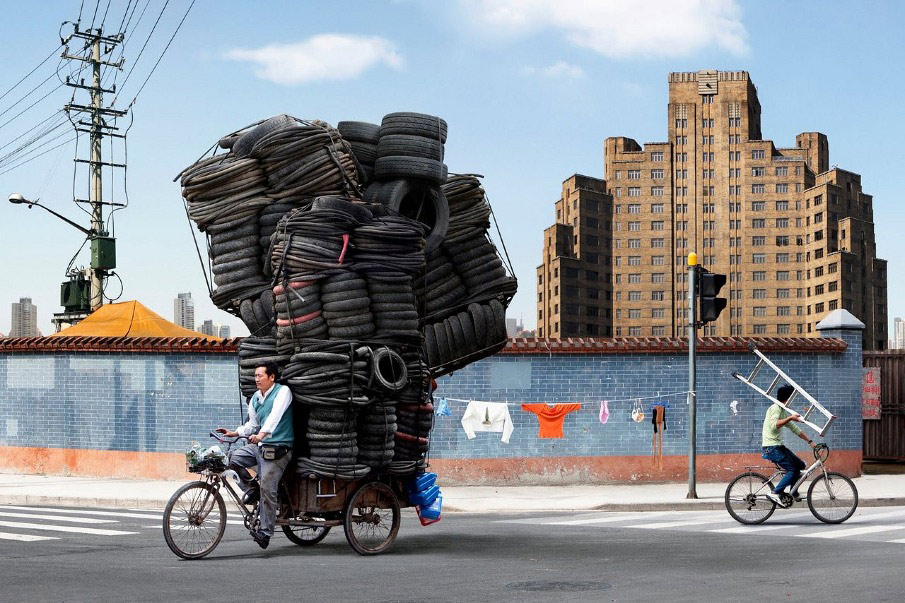 French artist Alain Delorme digitally distorts reality in his series “Totems” in which people are captured around Shanghai with precarious piles of objects. More images below.