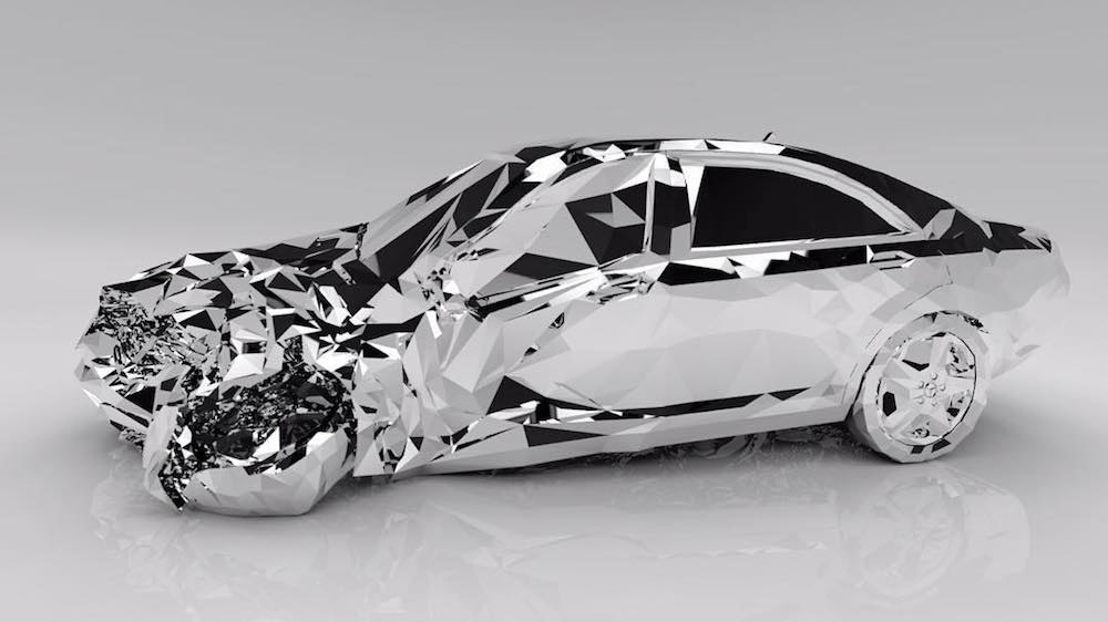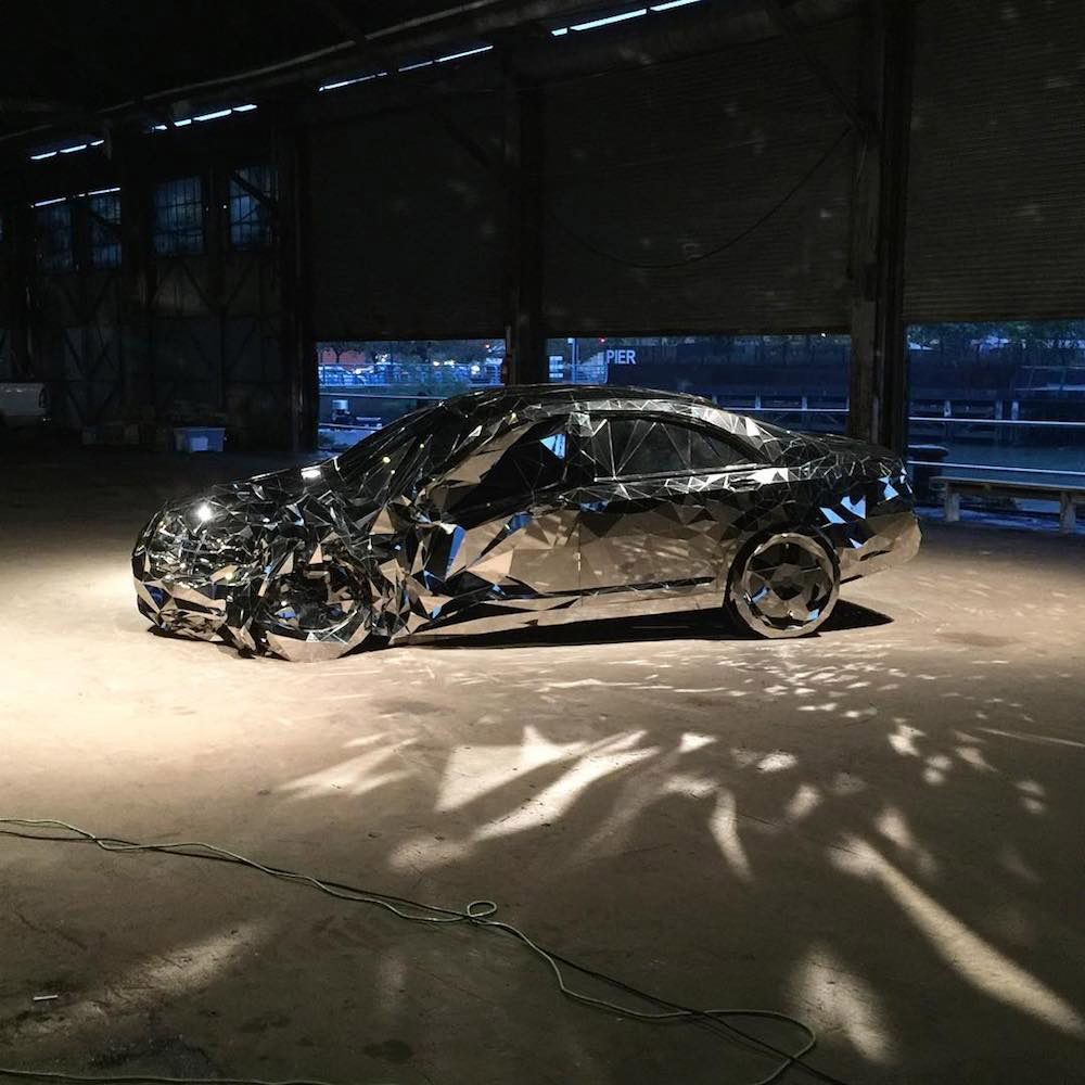 I had seen this first image floating around on Tumblr and assumed it was computer-generated! This is actually a life-sized replica of a smashed car composed of nearly 12,000 pieces of reflective stainless steel by New York-based artist Jordan Griska. While non-functioning, the sculpture is modelled after a Mercedes Benz S550 and is intended to highlight both the aspiration (luxury) and reality (mortality) of American culture. See more images of “Wreck” below.