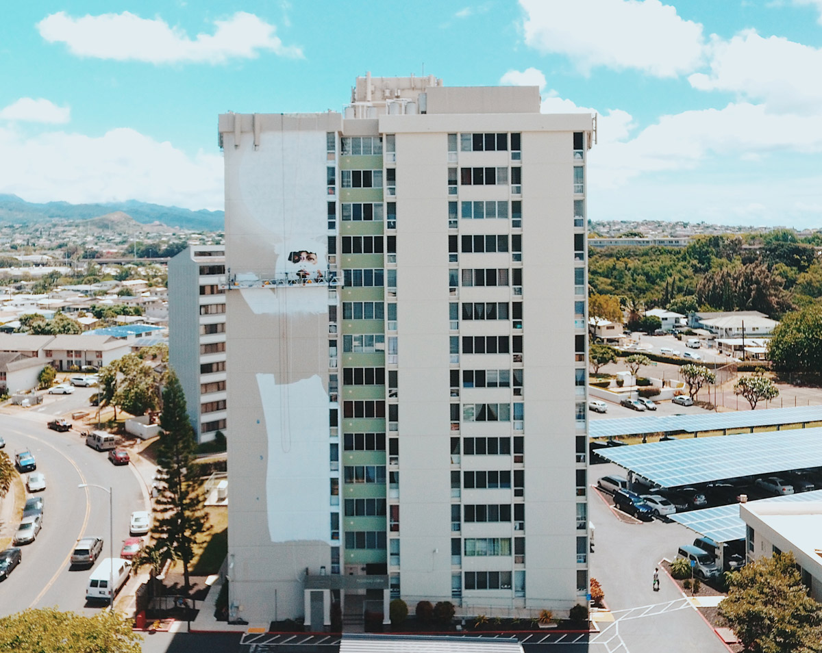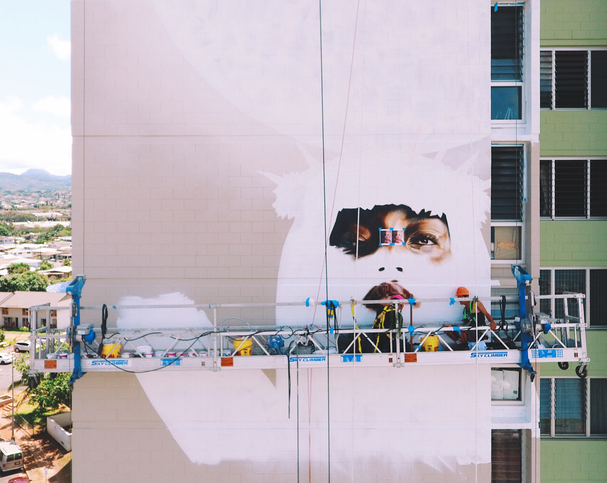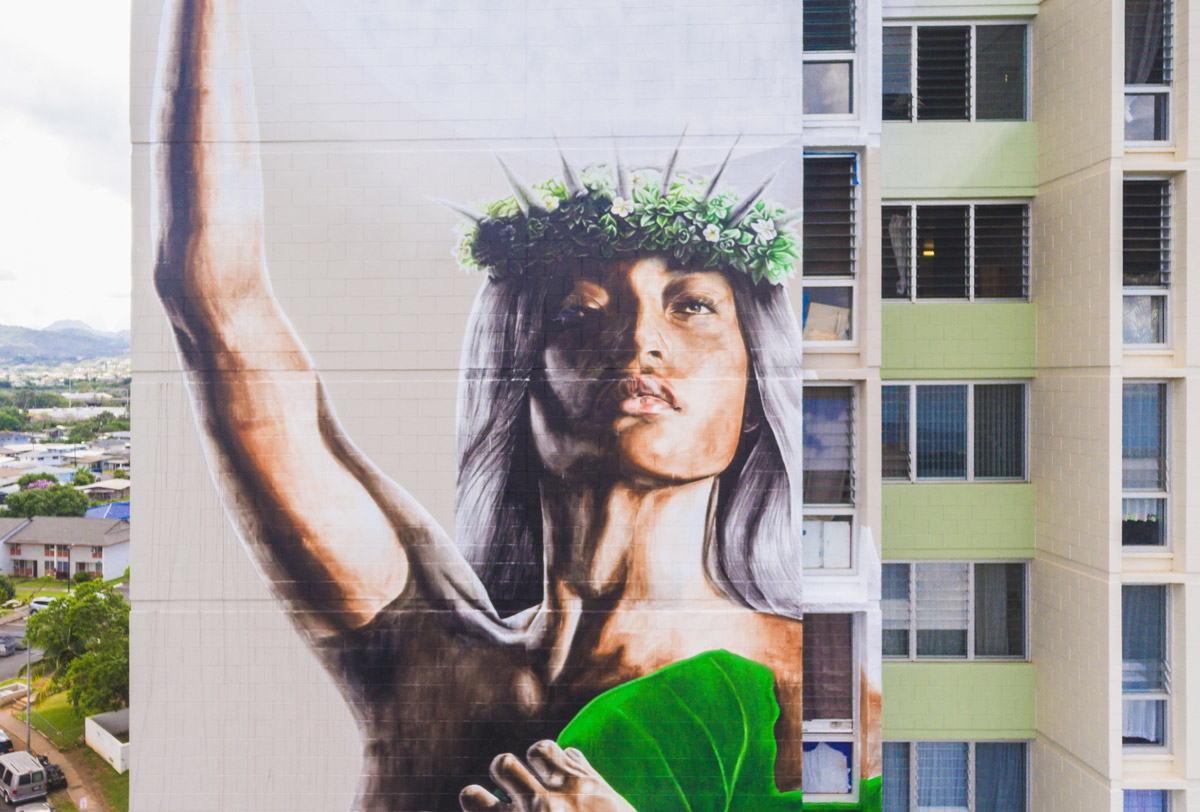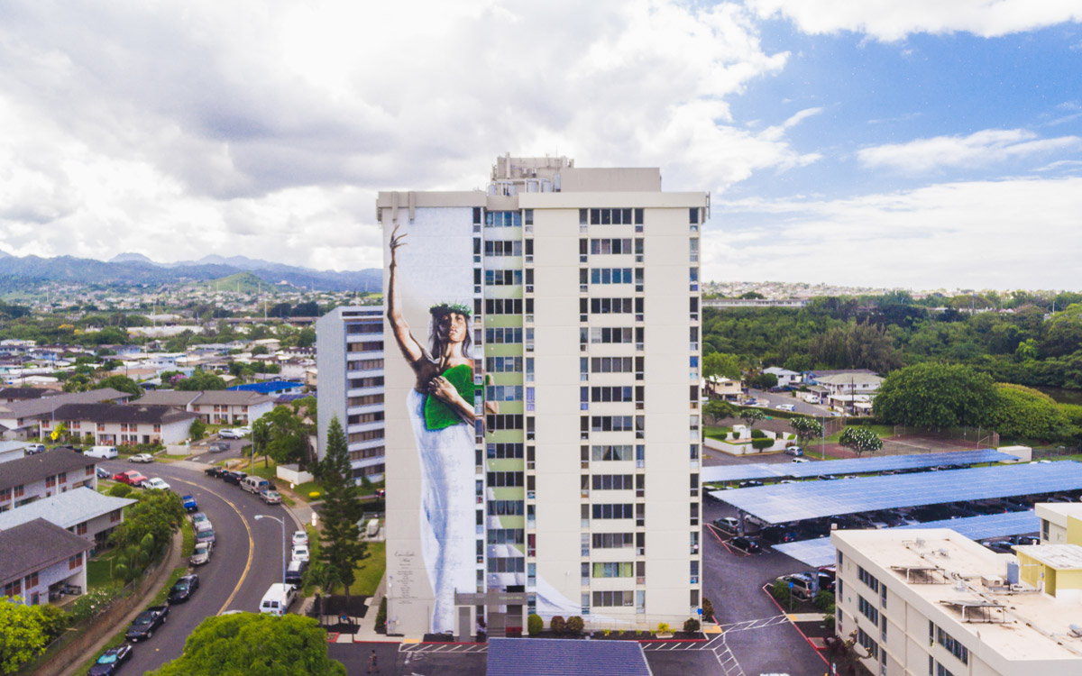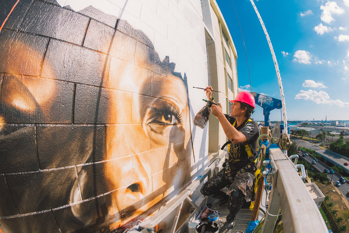 Artist Kamea Hadar has just completed what is now the largest portrait in the state of Hawaii; a 14-story mural of Hina, the Hawaiian Goddess of the moon. Under the guidance of another artist John Hina aka Prime, Hadar’s work continues to explore a modern-day form of mo’olelo or ancient Hawaiian storytelling.