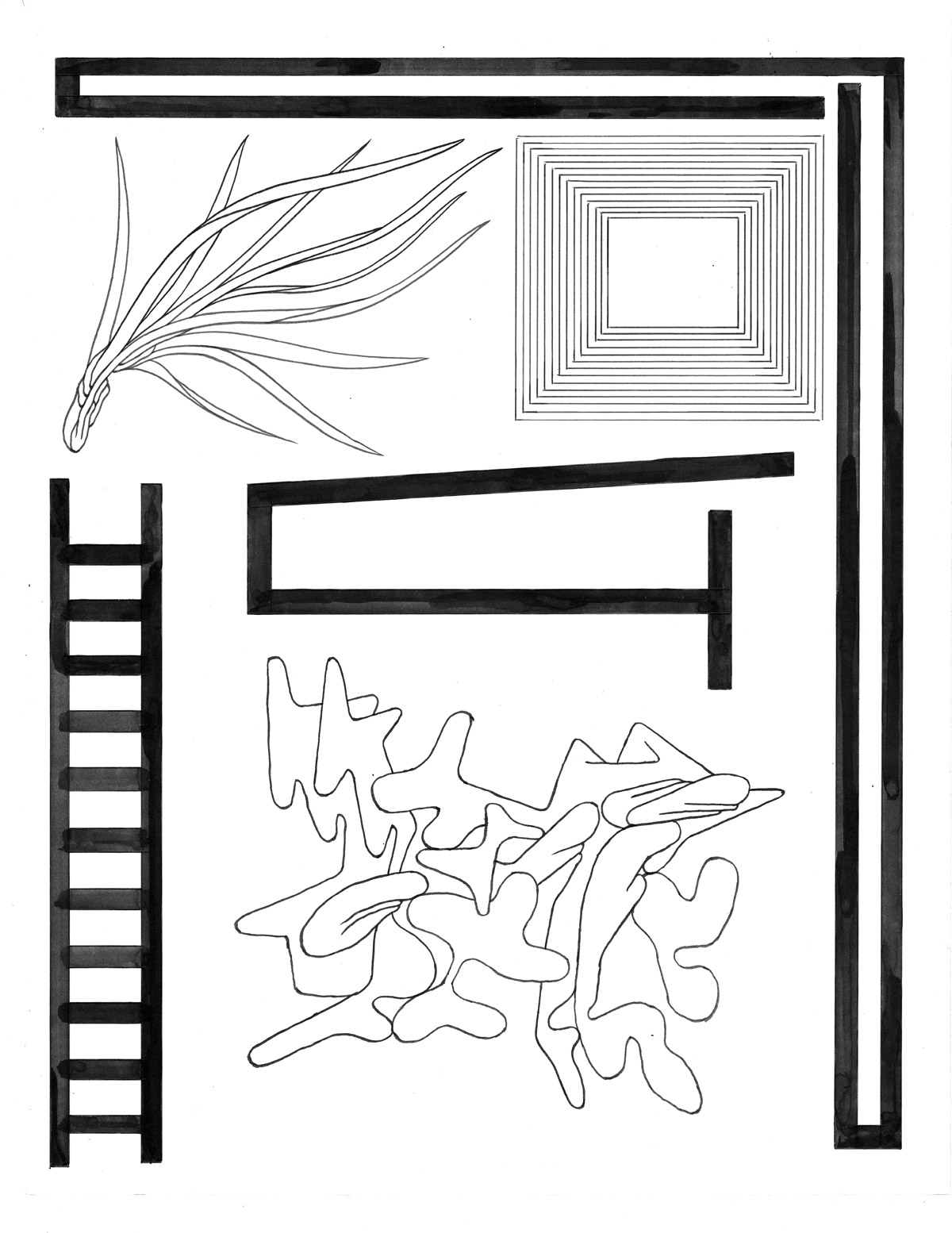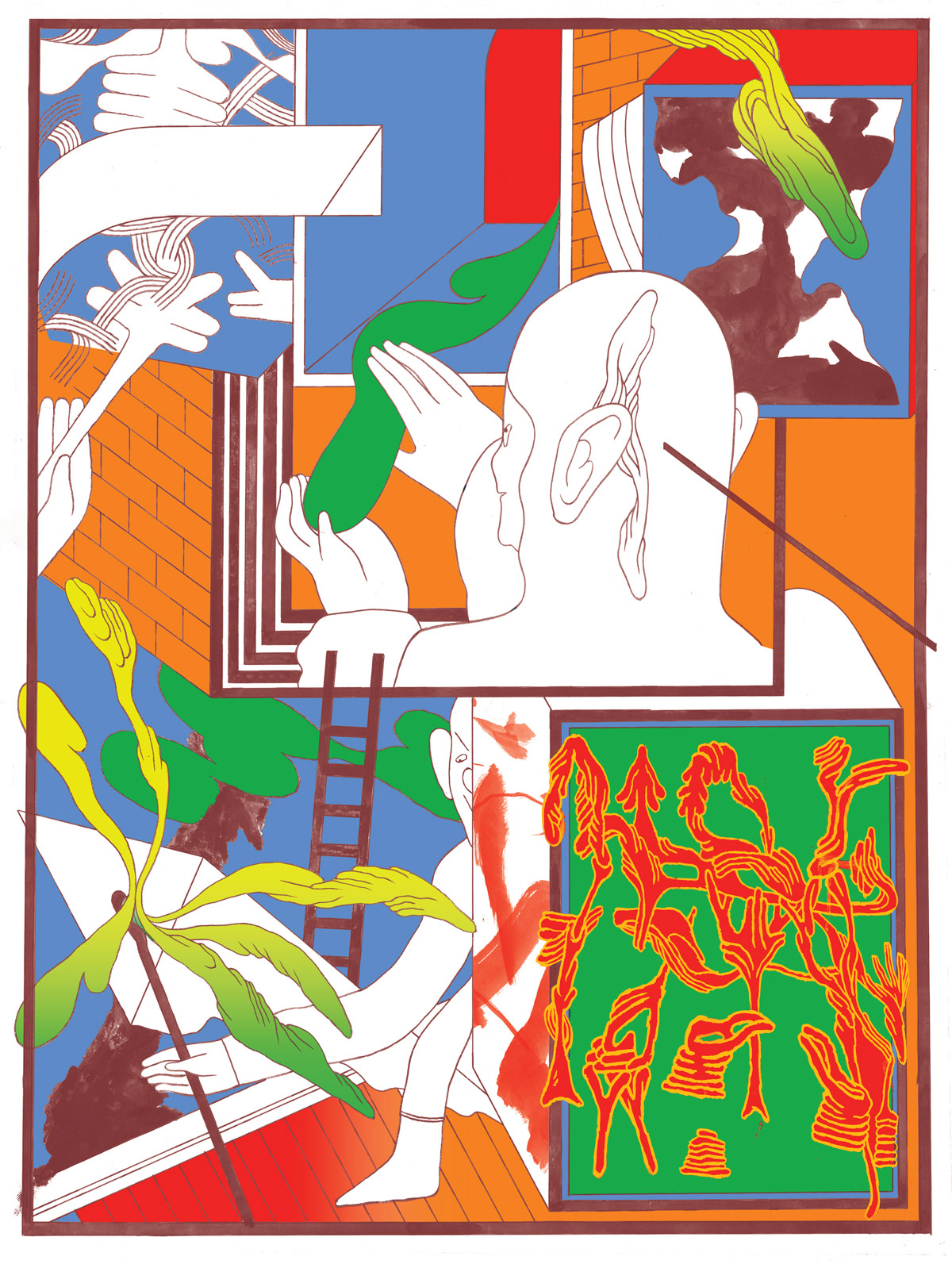 Patrick Kyle: The ladder is a motif for establishing the idea of space in a piece – especially in the more abstract images. They ground the images in reality – helps the viewer imagine the image as a physical space that you could move around and exist in.