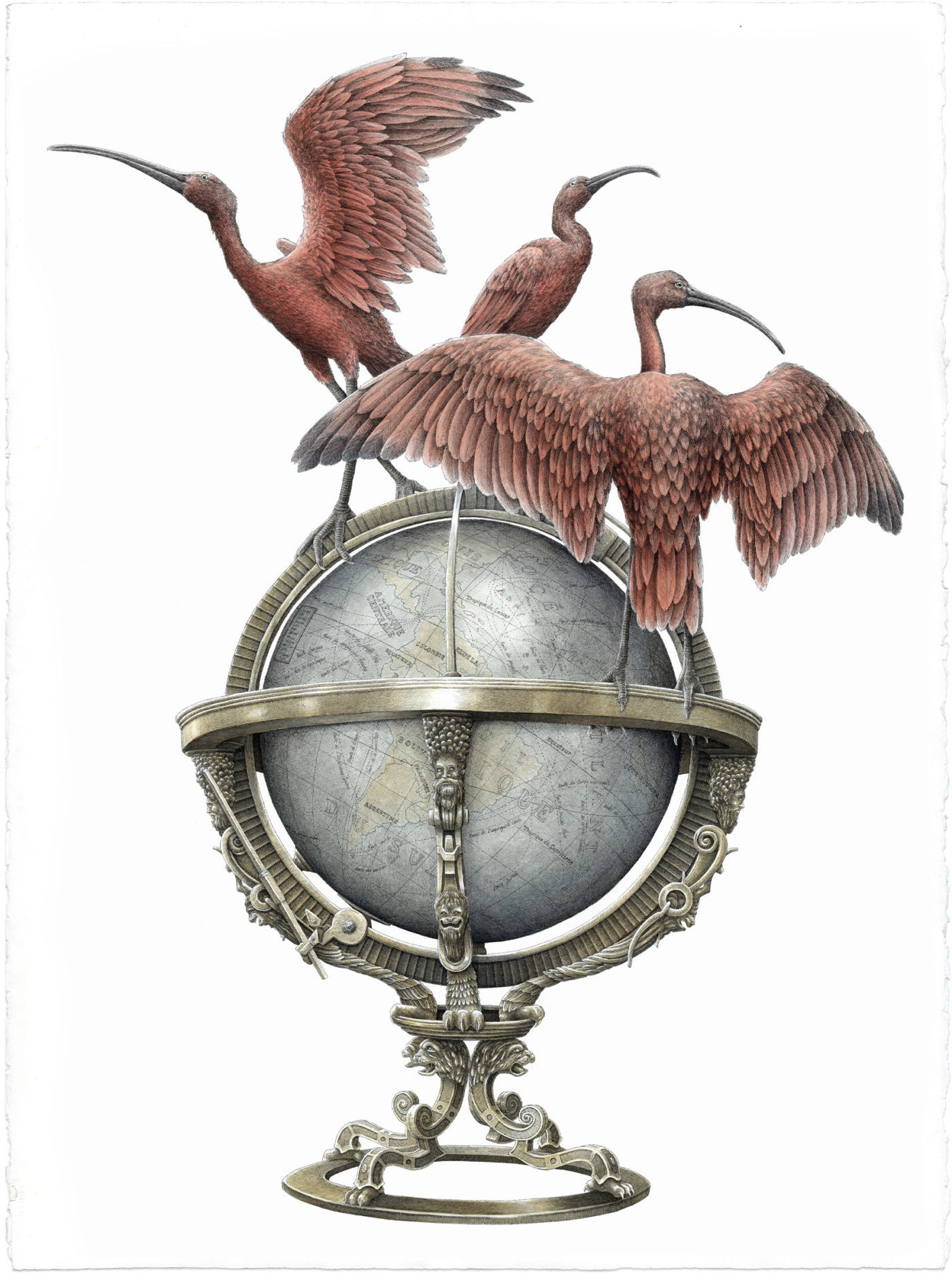 A series of birds perched on antique objects by French artist Steeven Salvat. Working with watercolour on pastel paper, Salvat collaborated with Parisian studio Sergeant Paper on a batch of limited edition Giclée prints from the project. Click here for details. Check out more images from “Perchés” below as well as a short timelapse video of Salvat working on the globe piece.