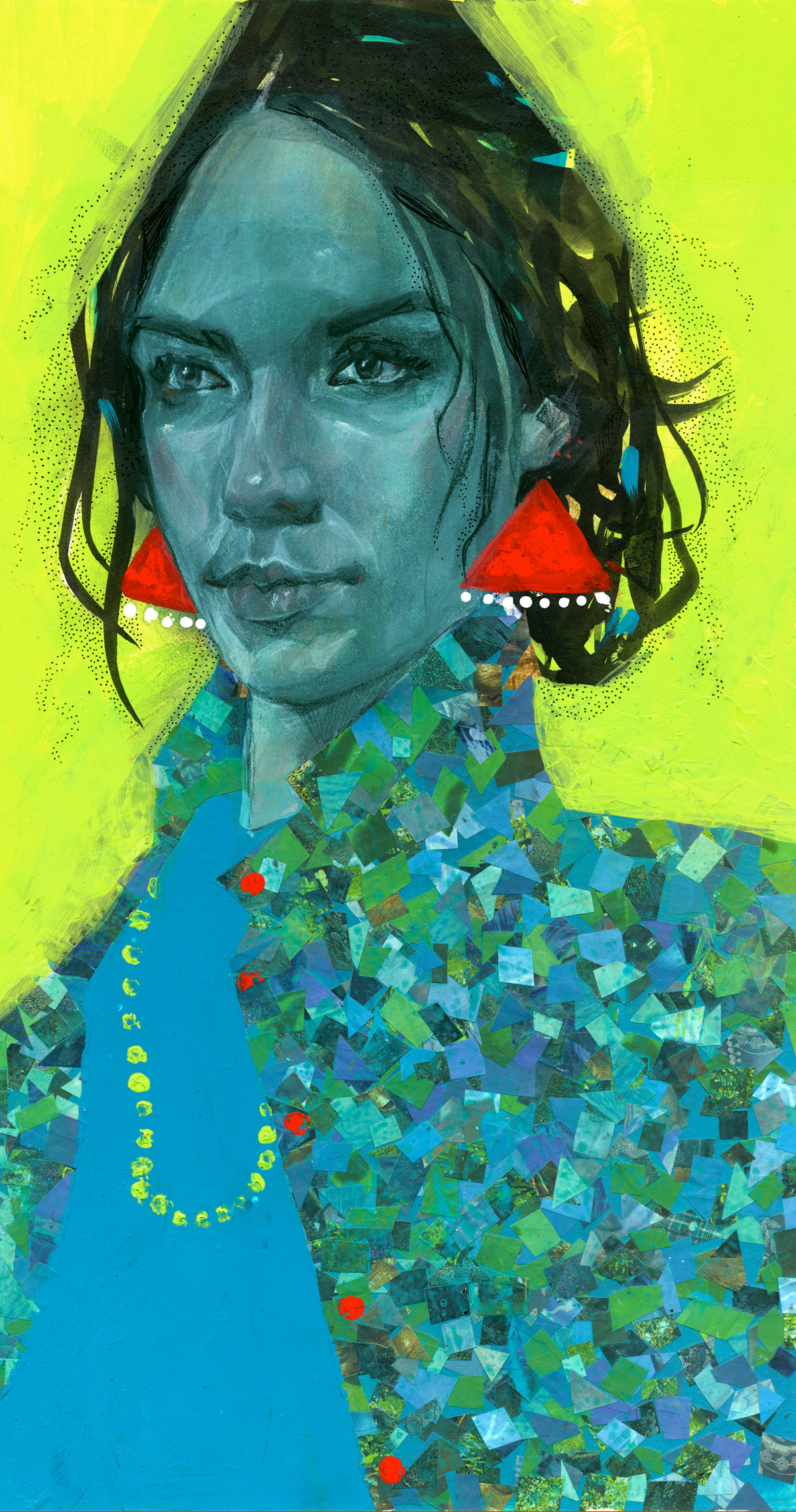 A selection of colourful portraits by artist and illustrator Sheila Nicolin from Detroit, Michigan. Drawing on her background in pattern design, Nicolin’s compositions explore her personal struggle to find a sense of calm and focus in the absence of silence through the use of bold colour and ‘loud’ prints: