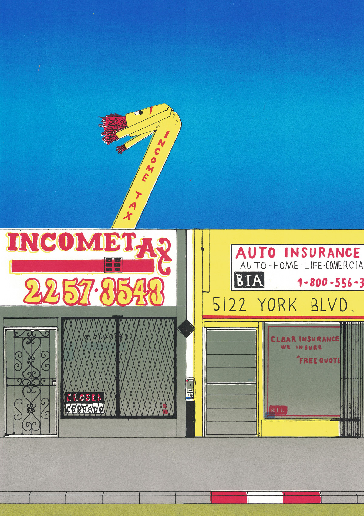 “I did this because it makes the process more interesting with space for the mistakes of the screen-print fit. Conceptually it resonates with the rough and sometimes absurd hand painted signs and logos that I saw on York Boulevard myself.”