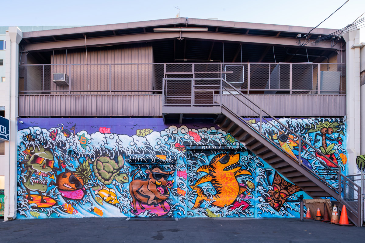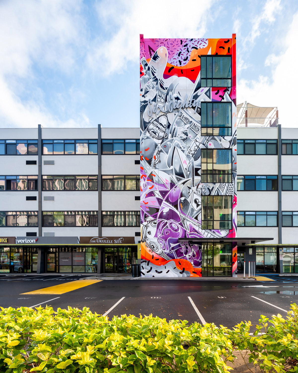Here’s a look at some of the many murals from this year’s POW! WOW! Hawaii festival! The image above is one of our favourites — Lauren YS and ONEQ destroyed this wall. Highlights from this year included artists talks from Logan Hicks and Shepard Fairey (who also celebrated his birthday during the festival), and an interactive sculptural piece by Aaron De La Cruz where people could take pieces home with them.