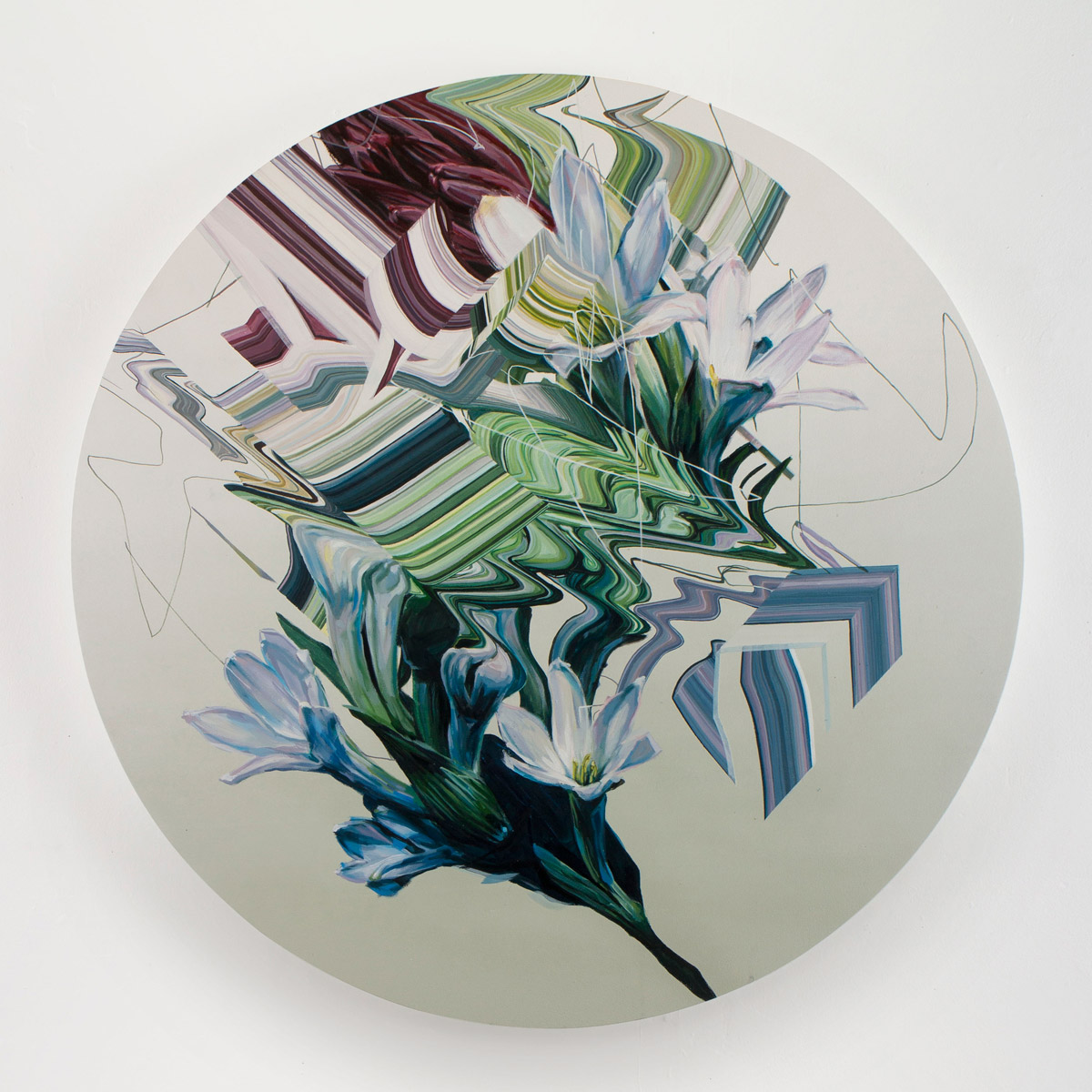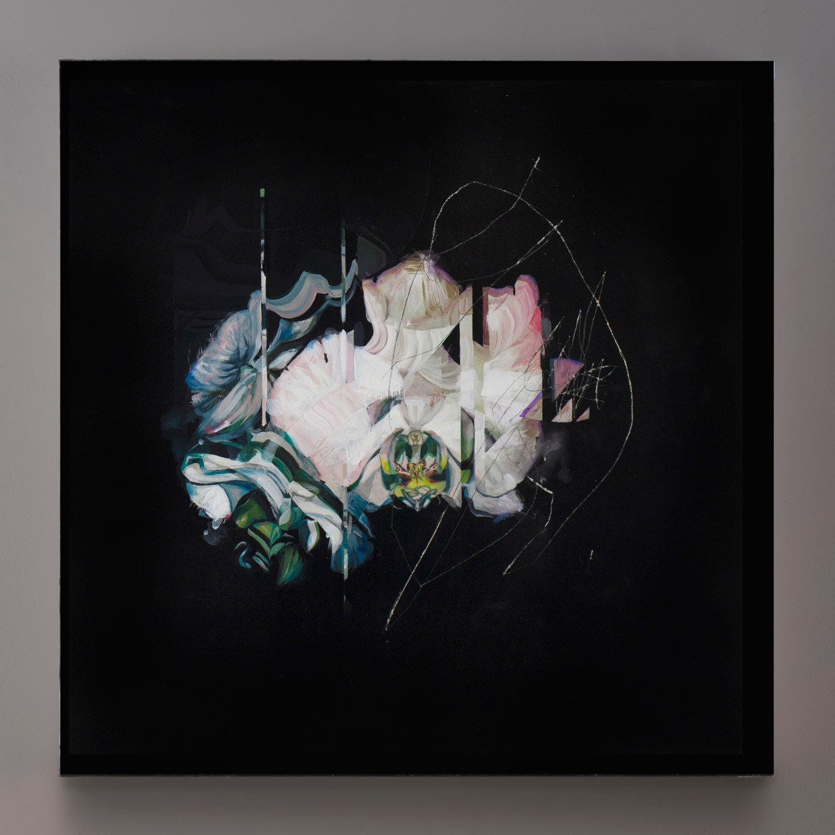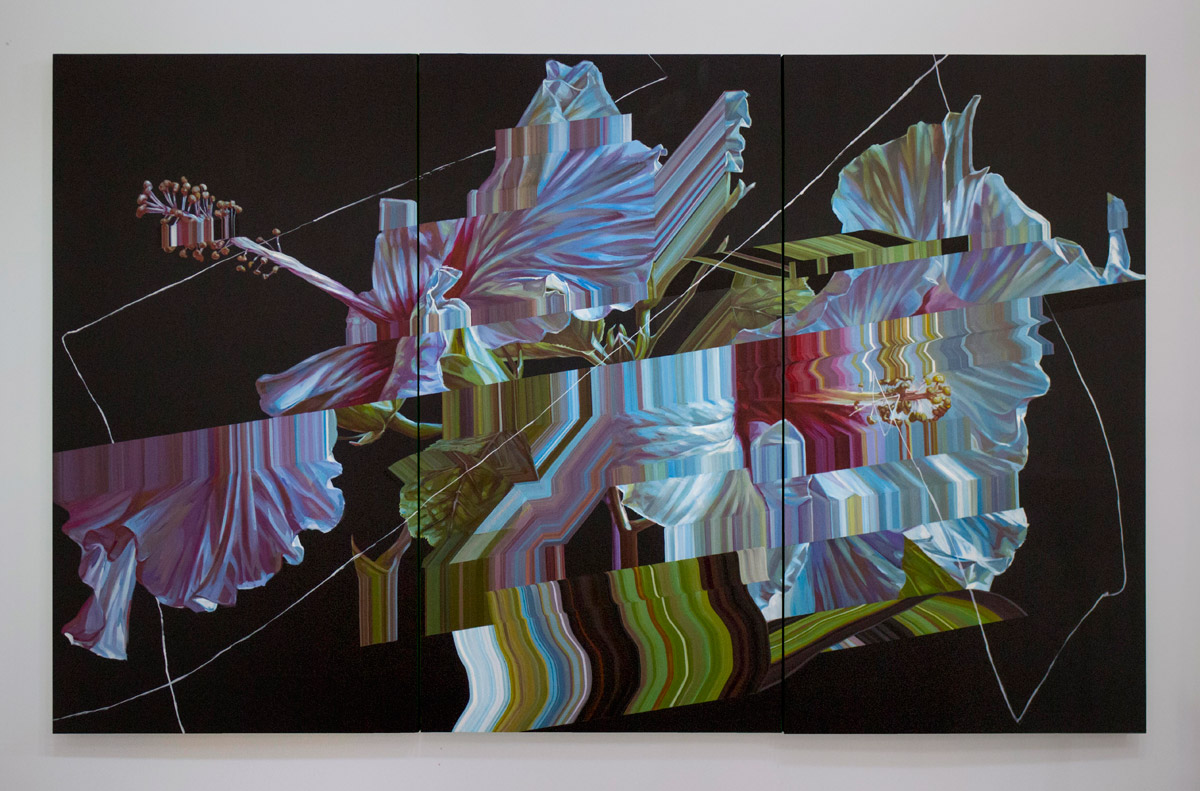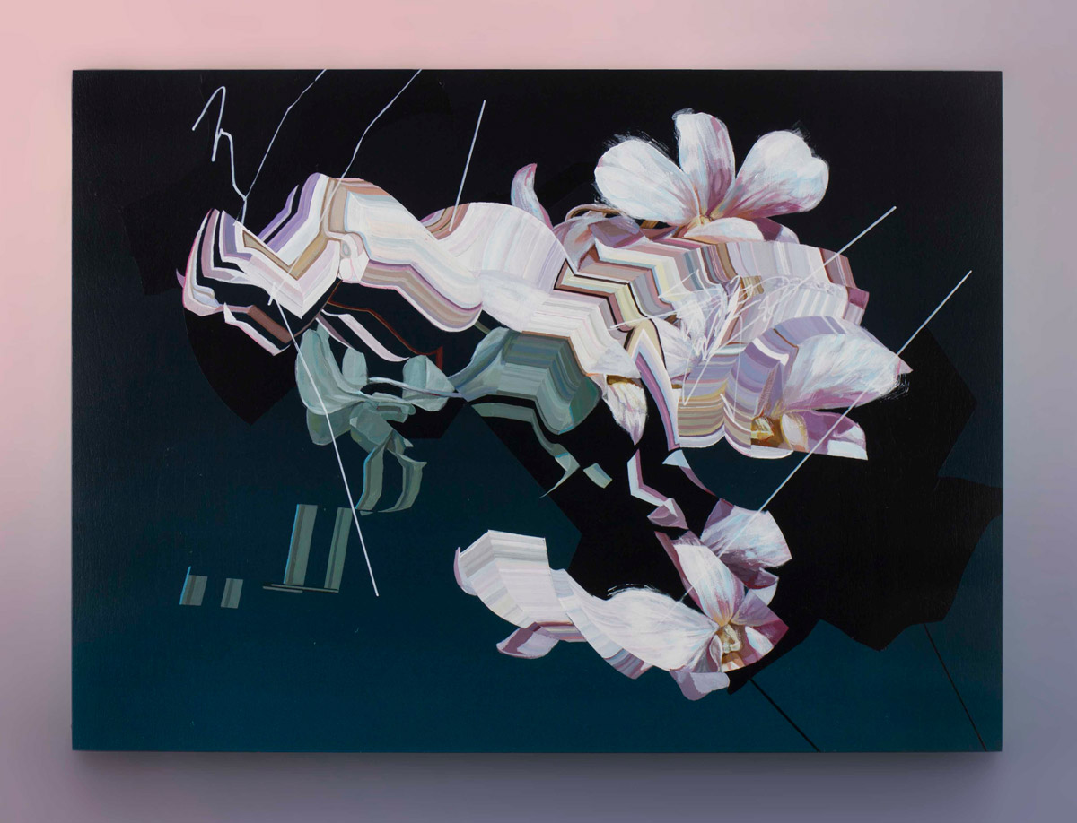 A couple years back a friend of mine, Ezra Kish, hollered at me to paint some nocturnal florals in The American, a bar here in the city. I hadn’t really fucked with floral all that much other than using them for the odd dressing in a piece. Instantly, it was freeing in the sense that all I’m working with are big shapes of colour, being pushed and pulled in a rudimentary way. And that’s kind of when all this flower madness started. I packed up all my tools and tricks I’d use on my narrative stuff and have gone full tilt floral style ever since. Despite being such traditional subject matter, this floral route has been really exciting. I think with my figurative works I would try to hide the fact that I’m using Photoshop. I guess I had these weird ideologies around traditional painting and integrating technology into it. But with this direction, I’m using it very explicitly to work my compositions into a much more abstract context. I’ve given myself permission to see how far I can take the subject matter to the precipice of identifiability and absurdity. I can build these compositions much faster as they’re not hyper cerebral explorations of the human condition but rather explorations of colour, texture and composition. And guess what? My phone rings more often.