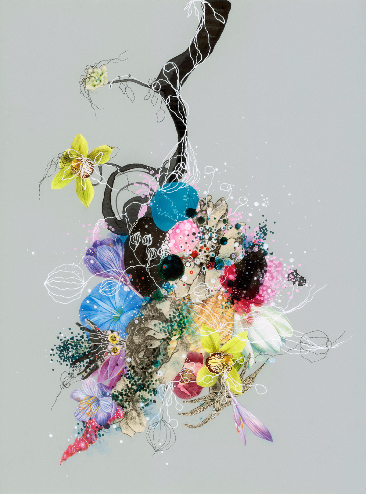 A selection of work by artist Jenny Brown from Providence, Rhode Island. Interested in ideas surrounding the existence of parallel or alternate universes, and finding ways to represent that visually, Brown’s work poses the question: “What if that alternative world wasn’t frightening, but instead a place where color, nature, and our souls made sense in their own unique and curious way?” As such, the process of creating art for Brown is not linear but, rather, a way of bringing everything from everyday curiosities, physical ephemera and mementos from past travels, together all at once “and sometimes infinitely with no end in sight.”