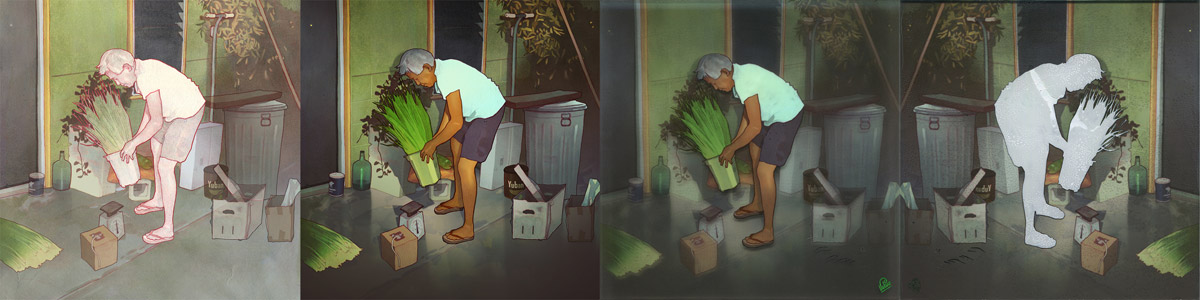 Once everything is placed into position, I continue by coloring and rendering the image in Photoshop. The output is printed onto Epson transparent film. Then I paint on the back of the film for final adjustments of color and solidify the main subject by painting white behind the figures. When it’s an animated piece of work, it’s completely digital.