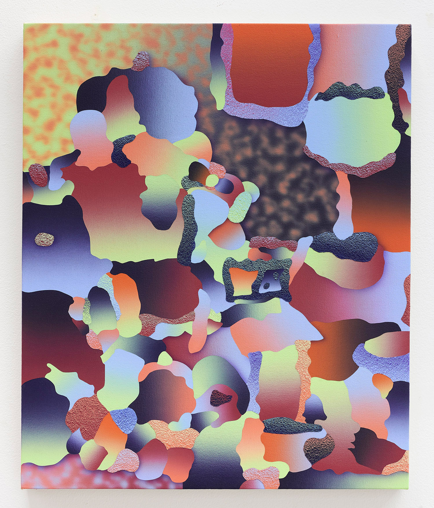 A selection of textured airbrush paintings from Massachusetts-born, New York-based artist Morgan Blair (previously featured here). Based on sketches initially molded in clay, Blair’s latest collection plays with shape, size, colour, and abstraction to offer up a kind of purposeful chaos. The titles of each piece (excerpts from a fictional autobiographical tell-all) as well as the name of the show (recovered from an old childhood drawing) similarly contribute to a sensorial confusion that nevertheless appears to adhere to a logic and rhythm all its own. In Blair’s words: