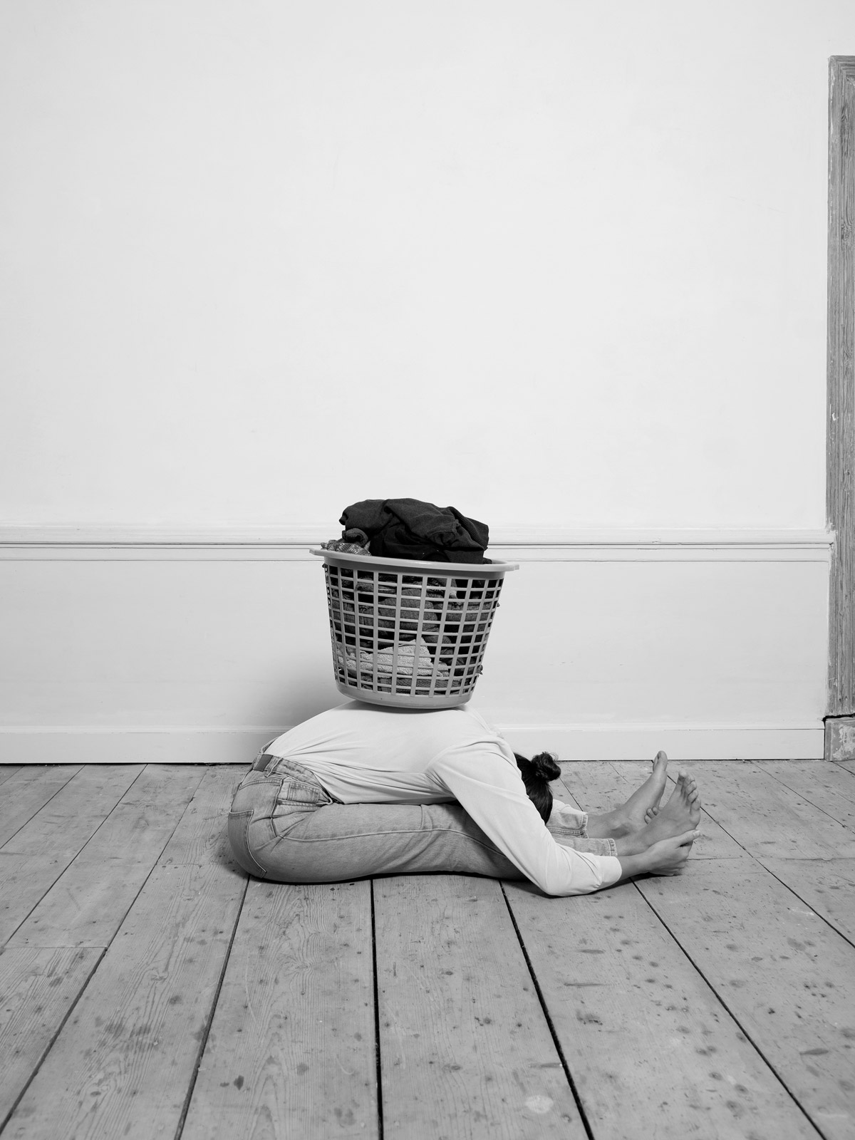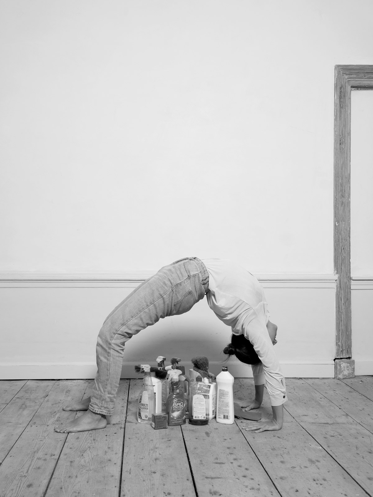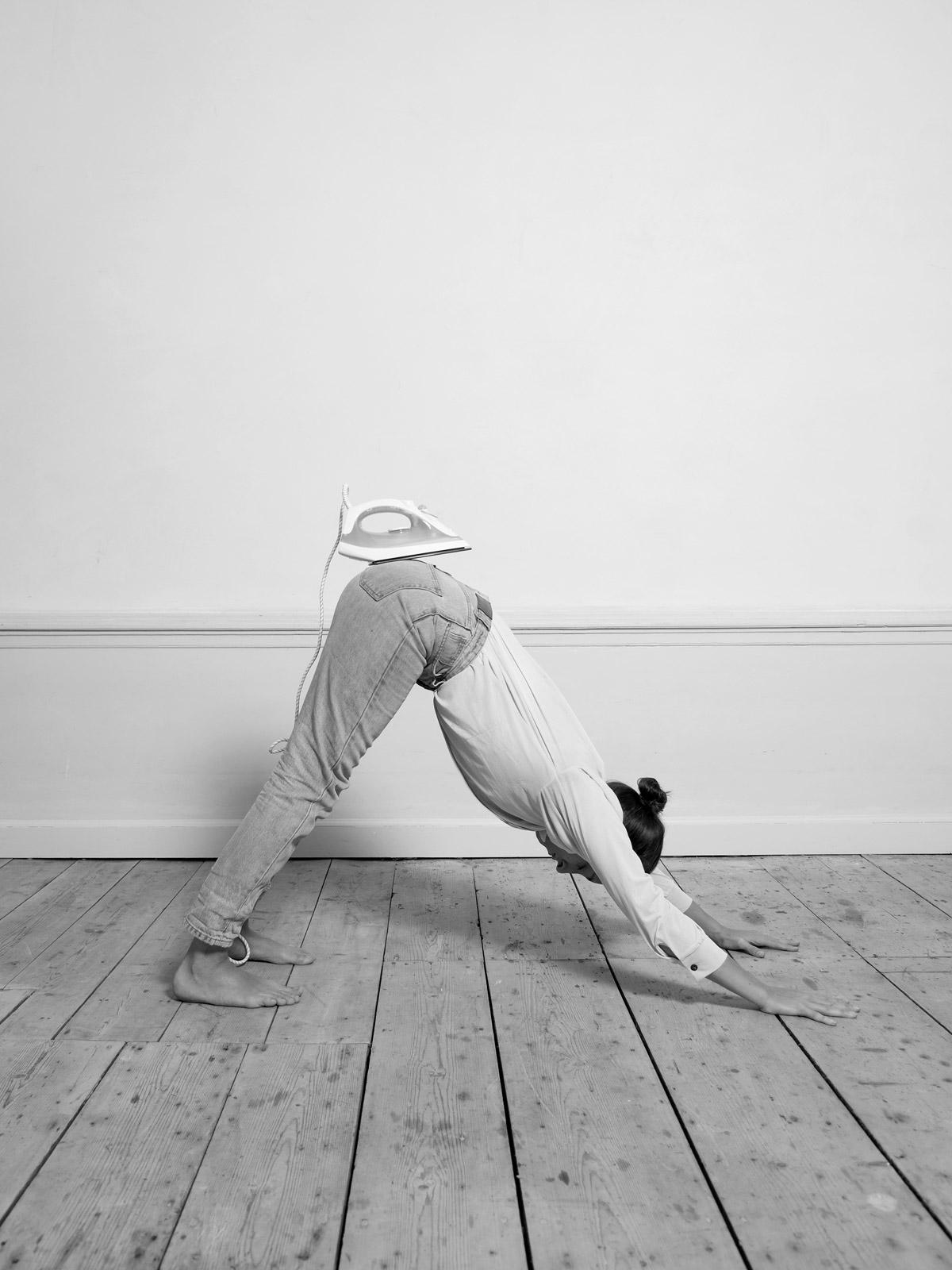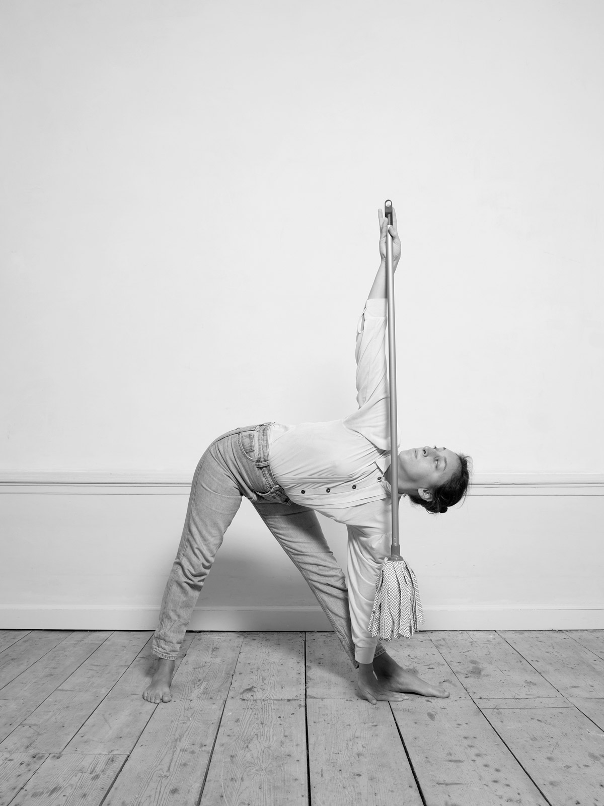 Her recent series, “House/hold”, is a tongue-in-cheek exploration of women’s position in western society. It sheds light on the housework gender gap with a playfully sarcastic series of photographs documenting her ironical solution: a 30 minute yoga session combined with domestic chores. Klenyánszki elaborates: