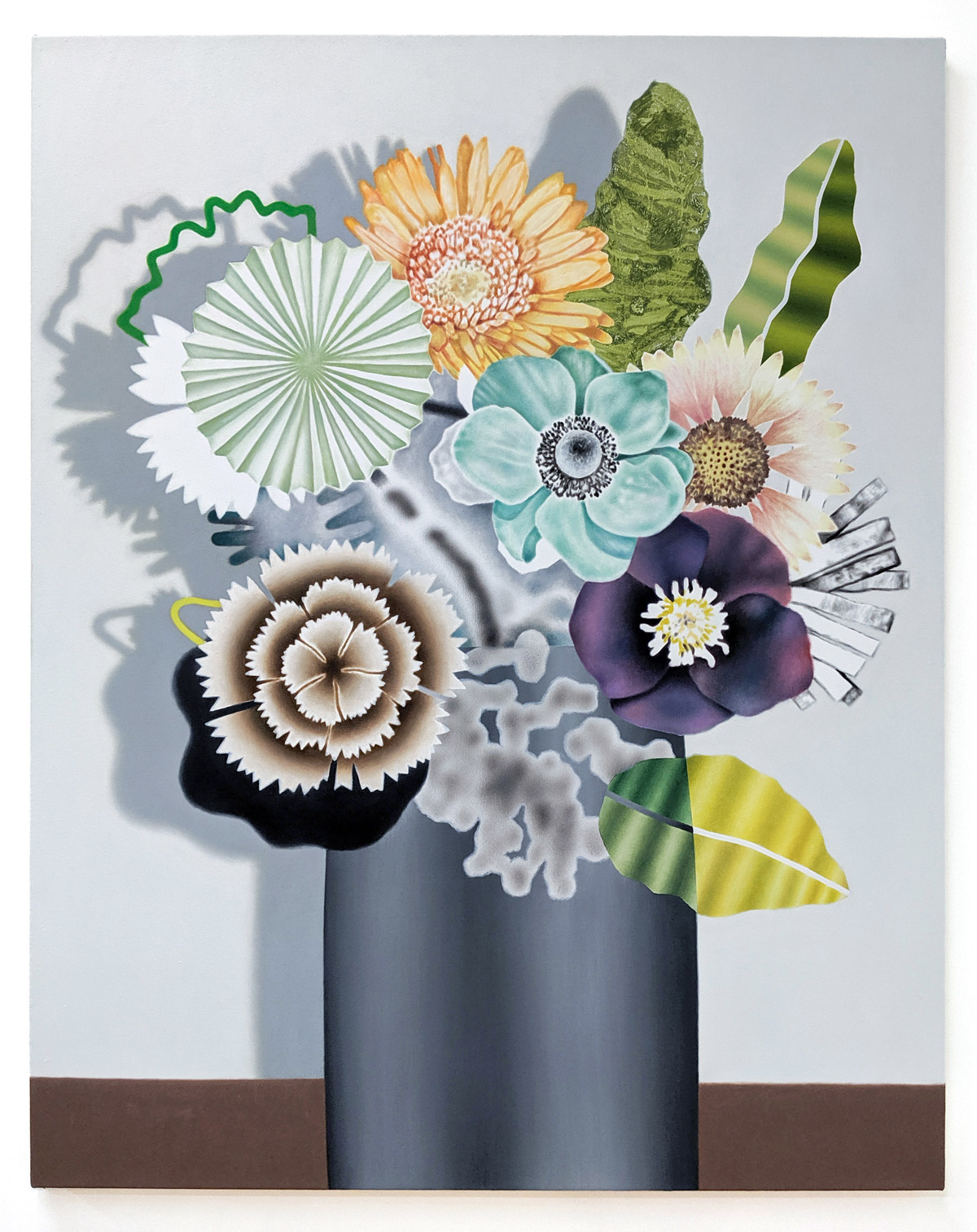 “At first glance the paintings may seem straightforward and literal but examining them closer will show signs of subtle disintegration of those assumed realities. Varied degrees of representation and rendering allow me to focus on specific ideas projected onto everyday objects and vessels. Mundane and inanimate items like fruit can take on anthropomorphic qualities by zooming in and blowing up certain attributes. Overall the paintings can be both familiar and uncanny, a sort of déjà vu. Still-life painting is a constant reformulation and reflection of society. I hope to augment and add to that ever evolving narrative.”