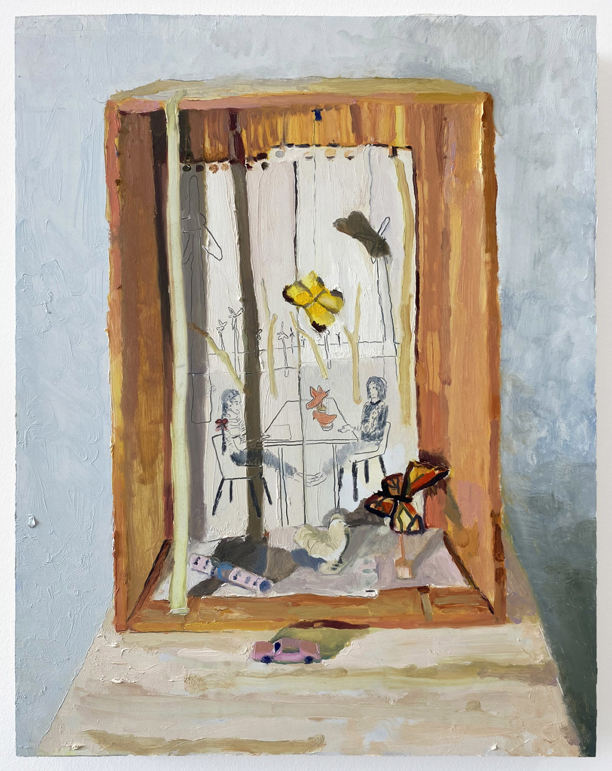 “The objects are arranged to depict lust, love, and expectation. The handmade objects within the paintings consist of paper birds, butterflies, drawings, and notes that add an additional layer of encapsulated thought.”