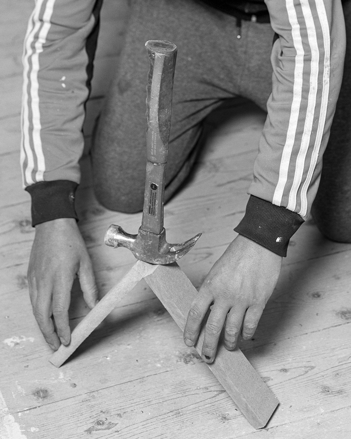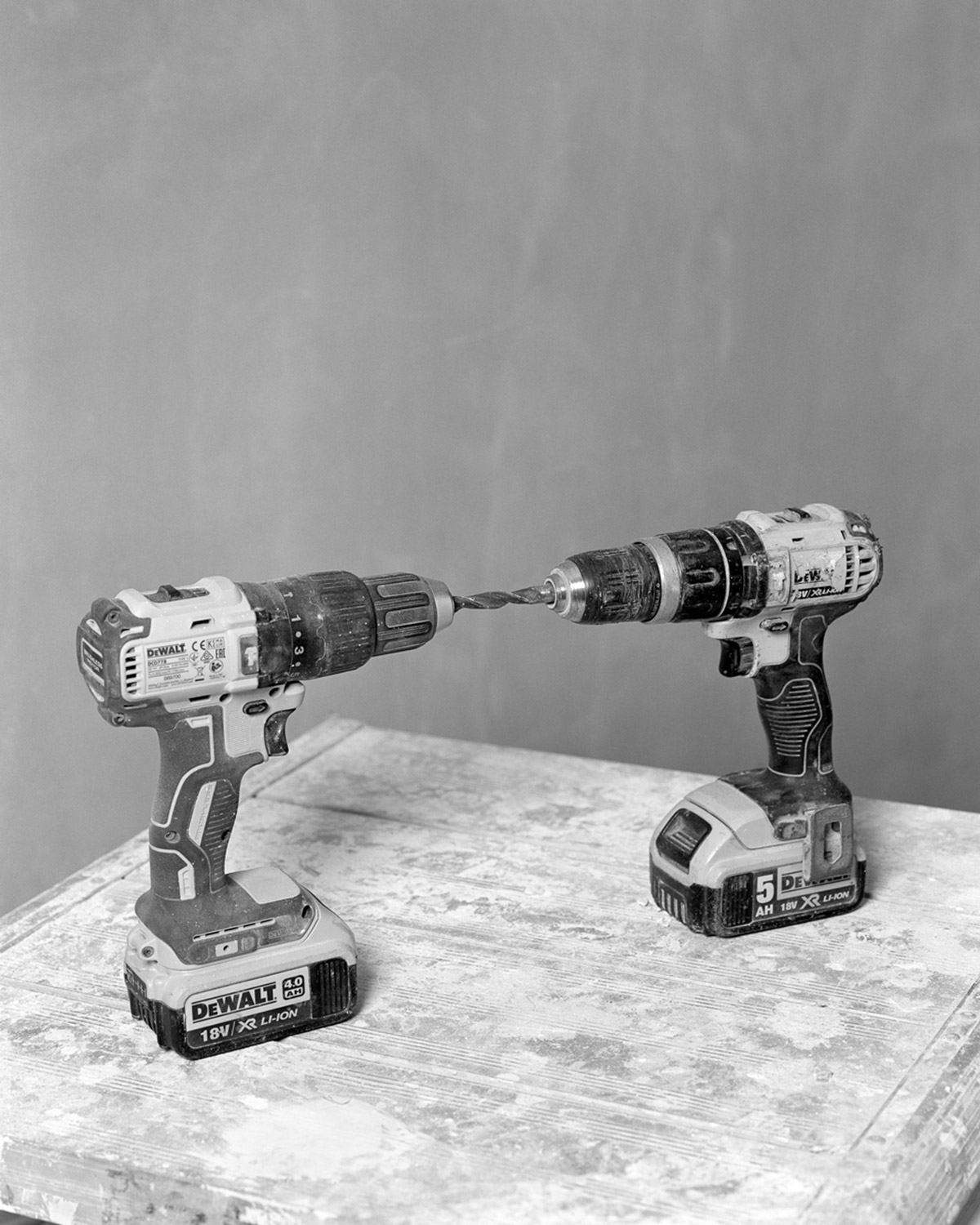 “This project reconfigures the workspace into a place for experimentation, where routine actions and conventional uses of objects are subverted. I hope to establish a gap through which narrative lines can slip out, inviting the spectator to reflect on aspects such as male performativity, tensions between technology and manual work, or the human body as a material in production processes.”