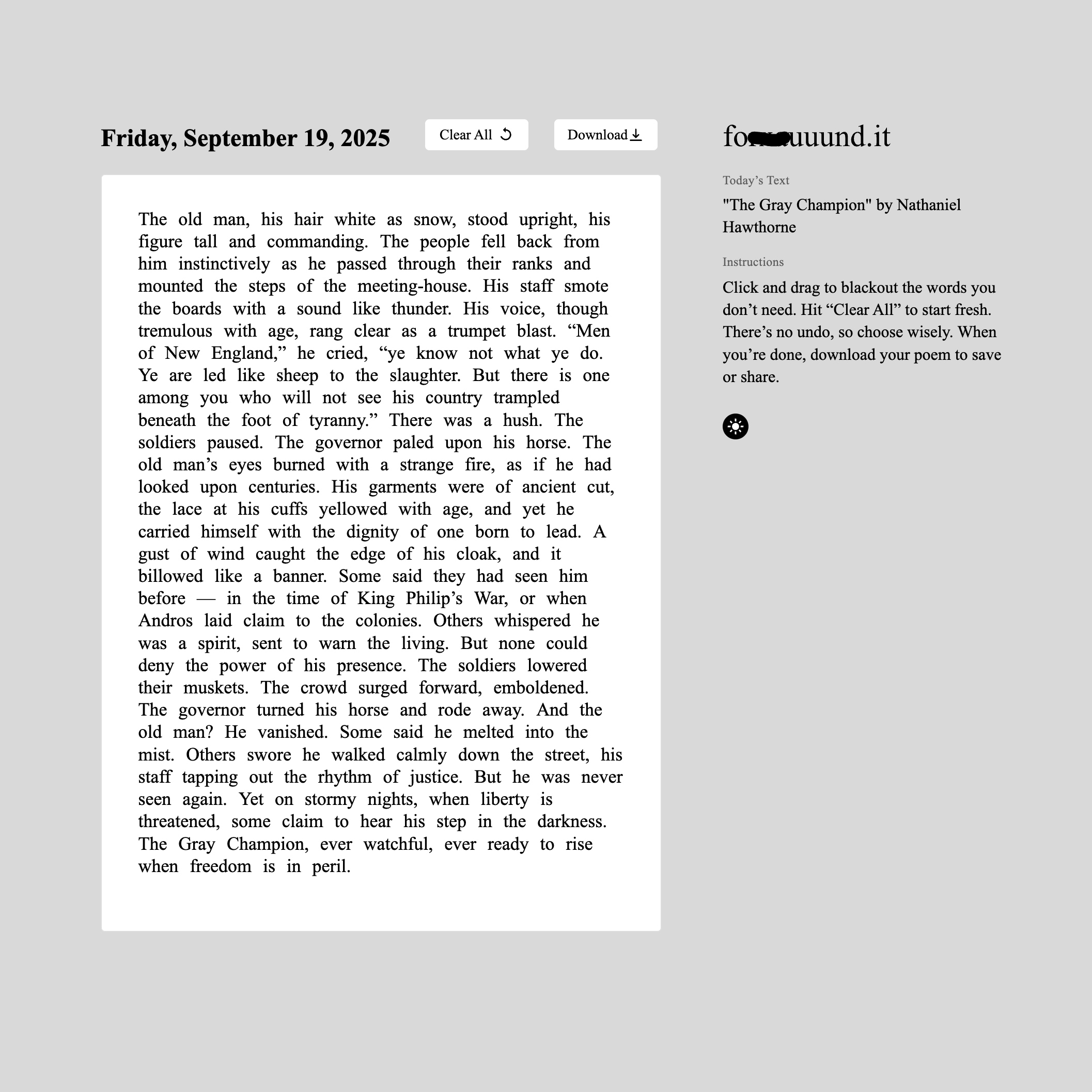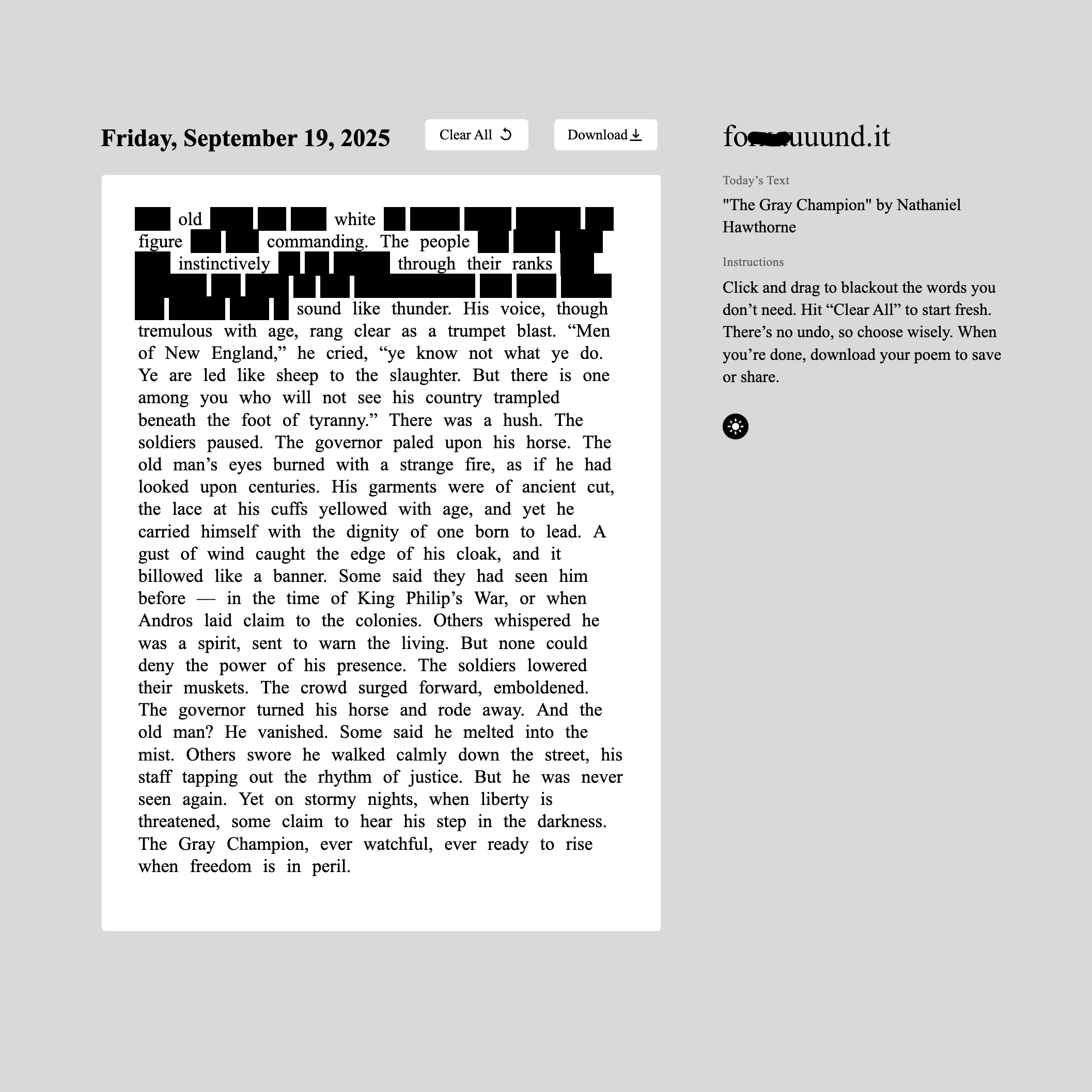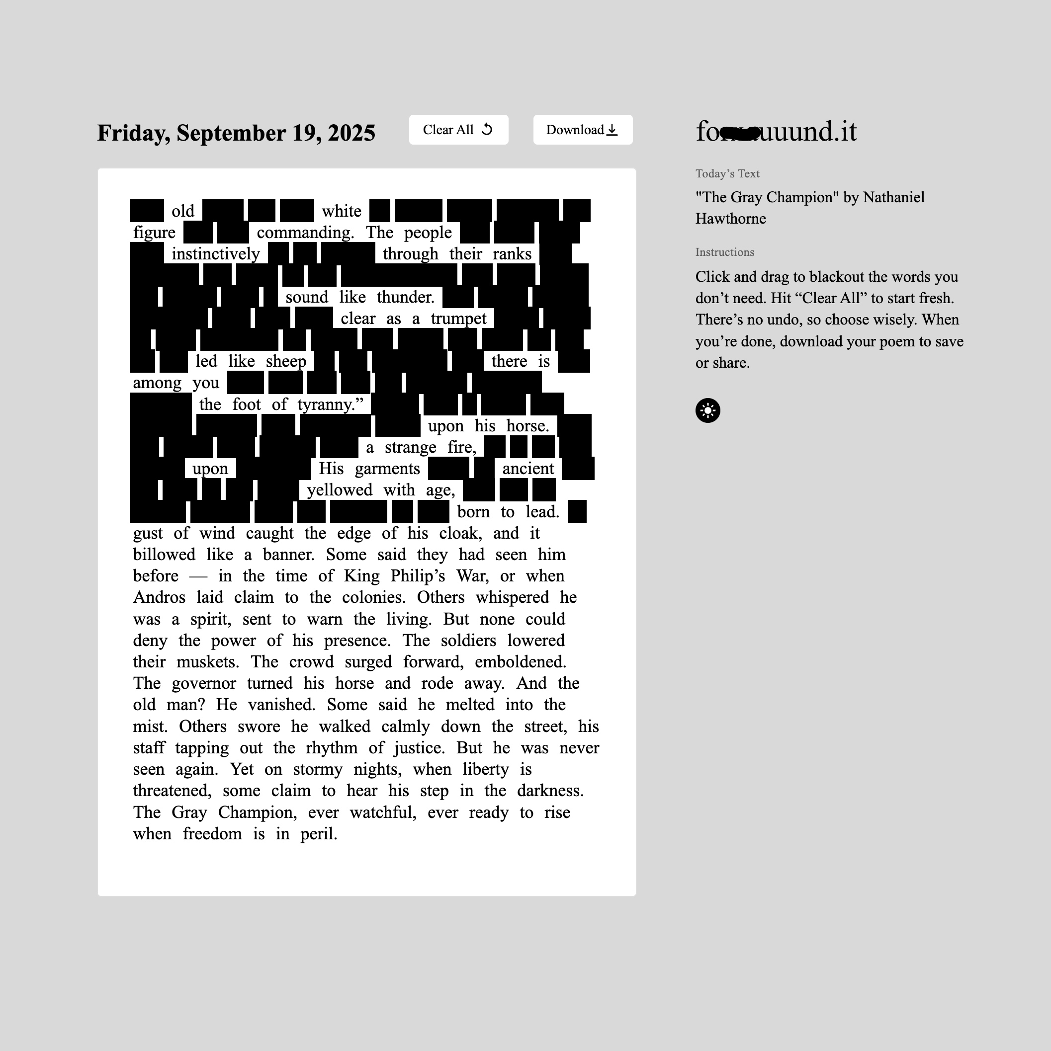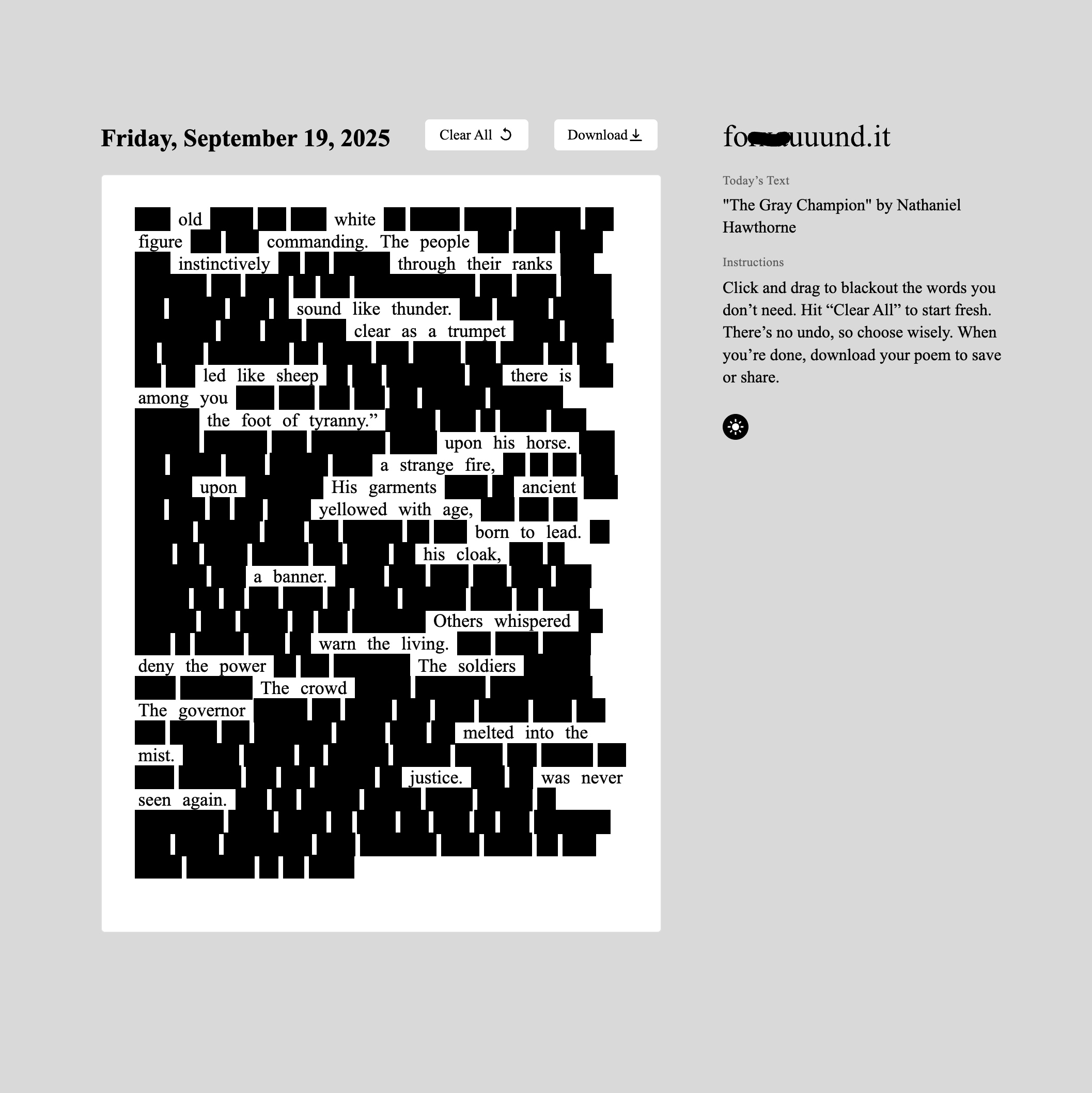 A daily outlet for creativity rooted in found language and blackout poetry by Dallas-based artist and writer Emily Edwards. Designed by Edwards, fouuund.it offers a new page each day that visitors can remix, reshape, and make their own.